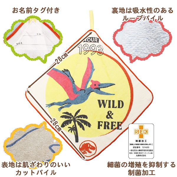ジュラシック ワールド 恐竜 ループ タオル 3枚セット ネームタグ付き 制菌 キャラクター 保育園 幼稚園 手拭き 男の子 ハンカチ ハンドタオル おしぼり