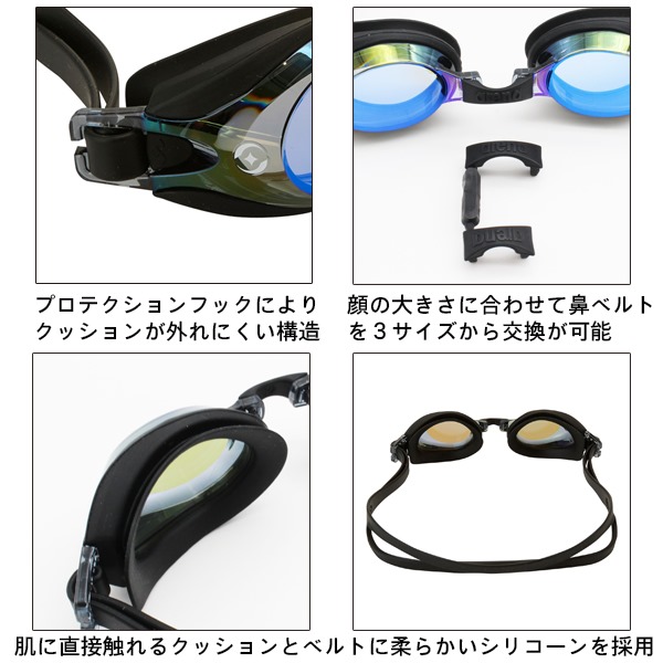 日本製、曇り止め加工、紫外線カット、クッション外れ防止構造、シリコーンクッション・ベルト