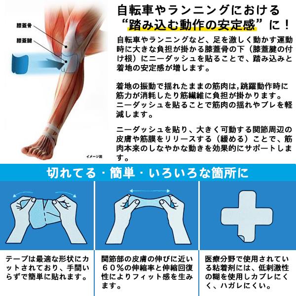 ●商品説明:自転車やランニングなど、足を激しく動かす運動時に大きな負担が掛かる膝蓋骨の下(膝蓋腱の付け根)にニーダッシュを貼ることで、踏み込みと着地の安定感が増します。