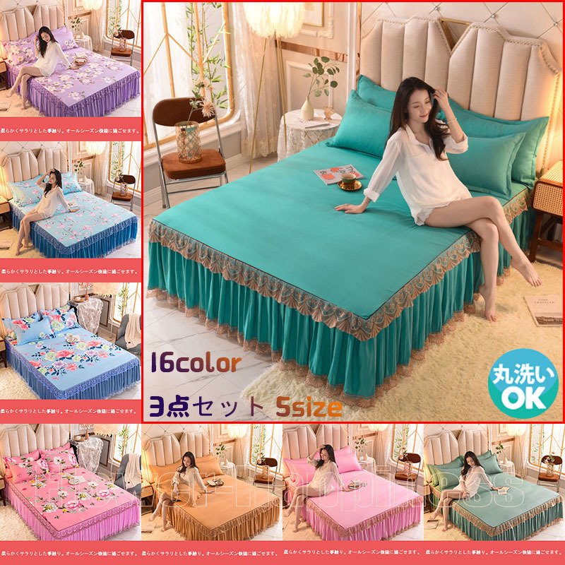 ベッドスカート ベッドシーツ ベッド用品 3点セット 寝具カバー 可愛い 姫系 型押し加工 枕カバー*2 ダブル 大きいサイズ洋式 花柄