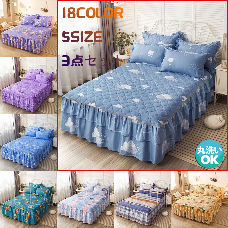ベッドスカート 3点セット フリル マットレスカバー 姫系 可愛い キルティング キルト 中綿 ゴム付き 丸洗い ウォッシャブル 耐久性