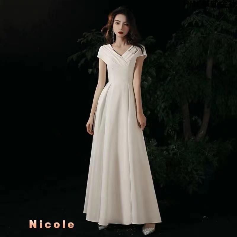 ウェディングドレス 結婚式二次会花嫁ドレス 白ワンピース大きいサイズ披露宴ロングドレス 袖あり vネック
