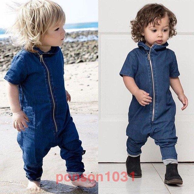 ベビーキッズ子供デニム風オーバーオール半袖つなぎおしゃれ