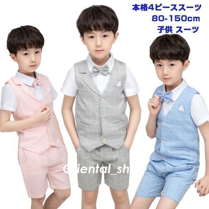 子供スーツ男の子半袖セットアップキッズ上下セット卒園入園式発表会結婚式ベスト+ズボン+シャツ+蝶ネクタイ4点セット卒業式