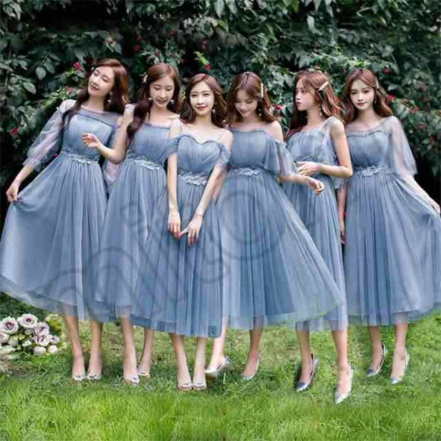 ブライズメイドドレス ミディアム丈ドレス ブルー グレー ピンク ドレス イブニングドレス パーティードレス Aライン