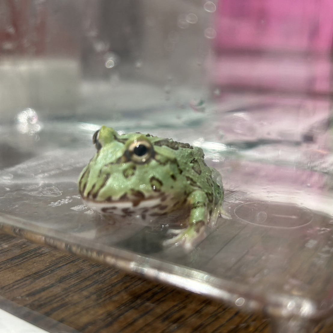 ベルツノガエルと並ぶツノガエルの代表格。ベルツノガエルと比べると角の突起が大きく、顔はシャープなのが特徴です。