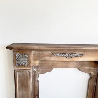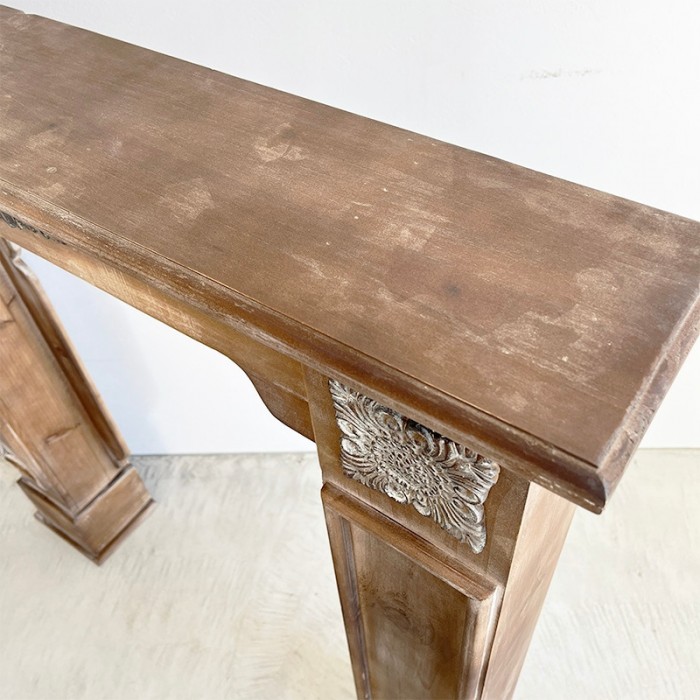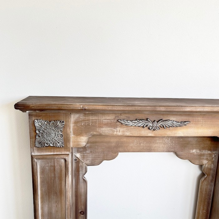 ヨーロピアンな装飾がポイントのマントルピース マントルピースとは暖炉周りの装飾的なフレームのことで、飾り棚としての意味合いがあります 暖炉をイメージさせることと自然に近い木の質感が温かい雰囲気です マントルピースと一緒に写真や美術的なオブジェを並べたり、周辺の壁に絵画や鏡を合わせて頂くとおしゃれな空間になります |