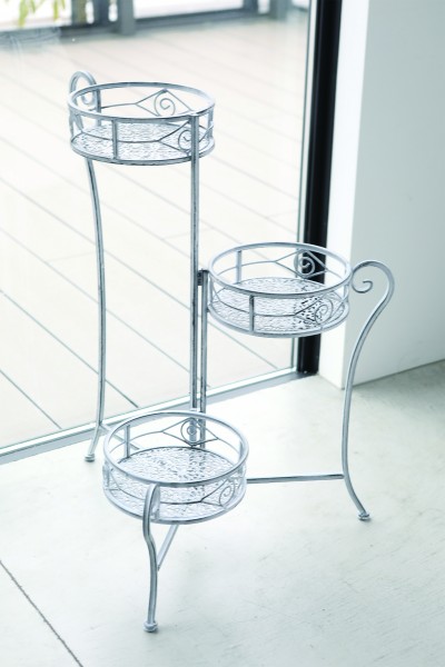 曲線の美しいデザインが魅力的な、3段タイプのフラワースタンド それぞれのバスケットが高さ違いで配置されているため、立体感のあるディスプレイが楽しめます