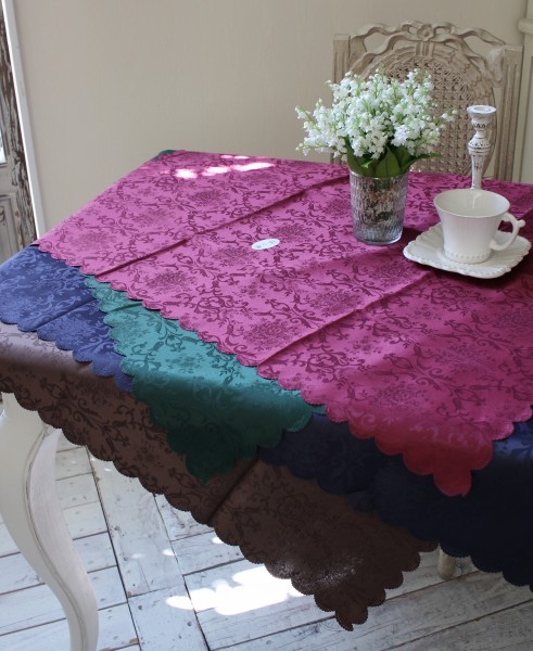 ダマスクローズの撥水シリーズでティーマット、ランチョンマット、ランナー2サイズ、トップクロス1サイズ、テーブルクロス2サイズ、ラウンドクロス1サイズがございます