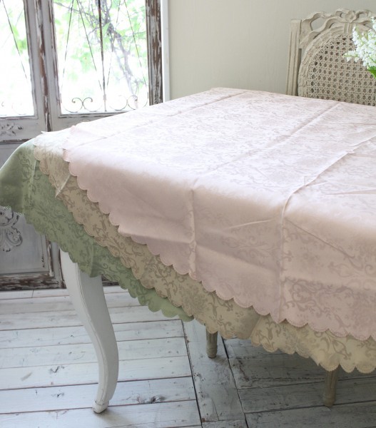 こちらは直径150cmサイズのラウンドクロス(丸形) 縁はスカラップ裁断のタイプ、薄地で普段使いに便利なお品です