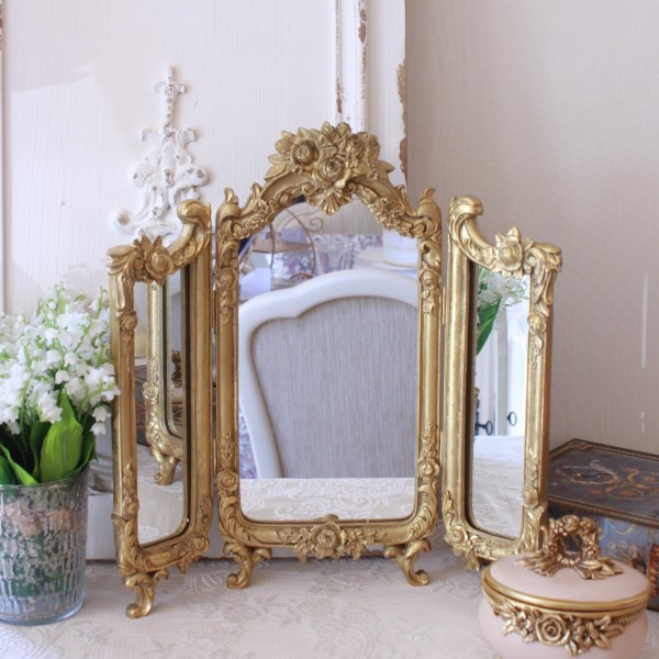 商品説明 | 豪華な薔薇のレリーフを装飾した重厚感のあるアンティーク調の三面鏡 バロック調のデコラティブなデザインで存在感があり、お部屋がロマンチックな雰囲気になります