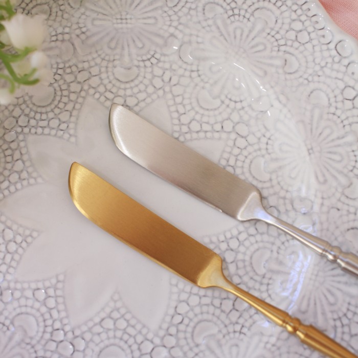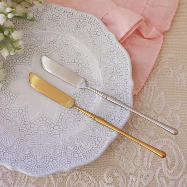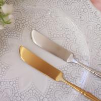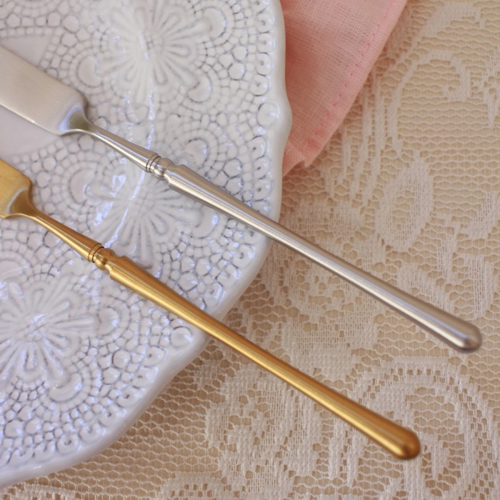 マットなゴールドとシルバーのお色や、シンプルなディテールは輸入品ならではのお品です 軽すぎず適度な重みが手に馴染みも良いです ステンレス製ですので錆びず、くすまず、お手入れも簡単です シリーズのディナーカトラリー、ケーキフォーク・ティースプーンもございます