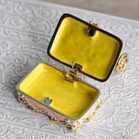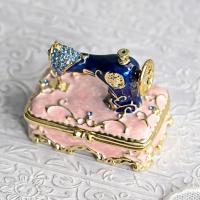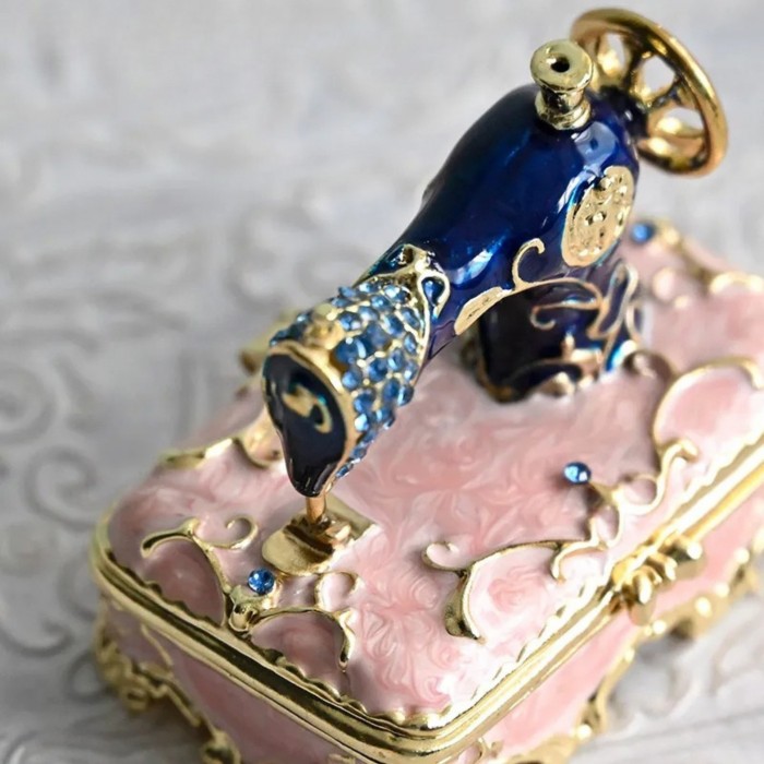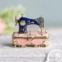エナメル風に仕上げた上品なピンク色のボックスに、細部まで繊細にデザインされたアンティーク調のミシンを乗せ、ラインストーンを装飾した高級感のあるジュエリーボックスです
