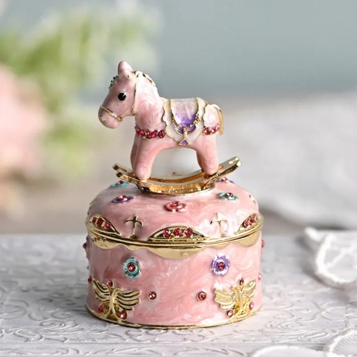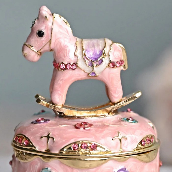 エナメル風に仕上げた上品なピンク色のロッキングホースが、カラフルなお花を散りばめたボックスに乗ったロマンチックなデザインです