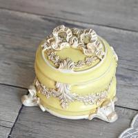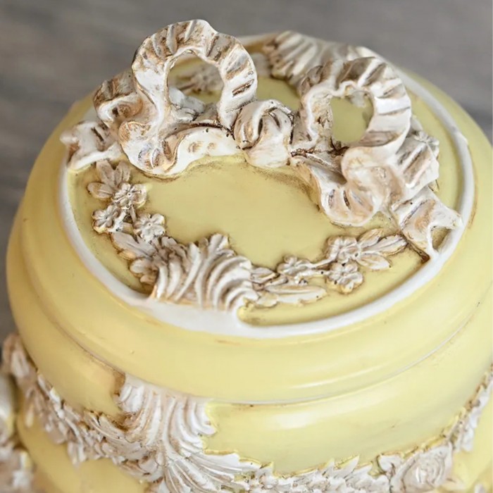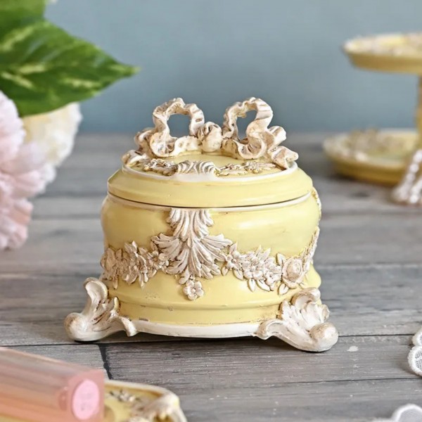 商品説明 | トップの大きなリボンと薔薇や花々のレリーフが美しい上品でおしゃれなパステルイエローの小物入れ