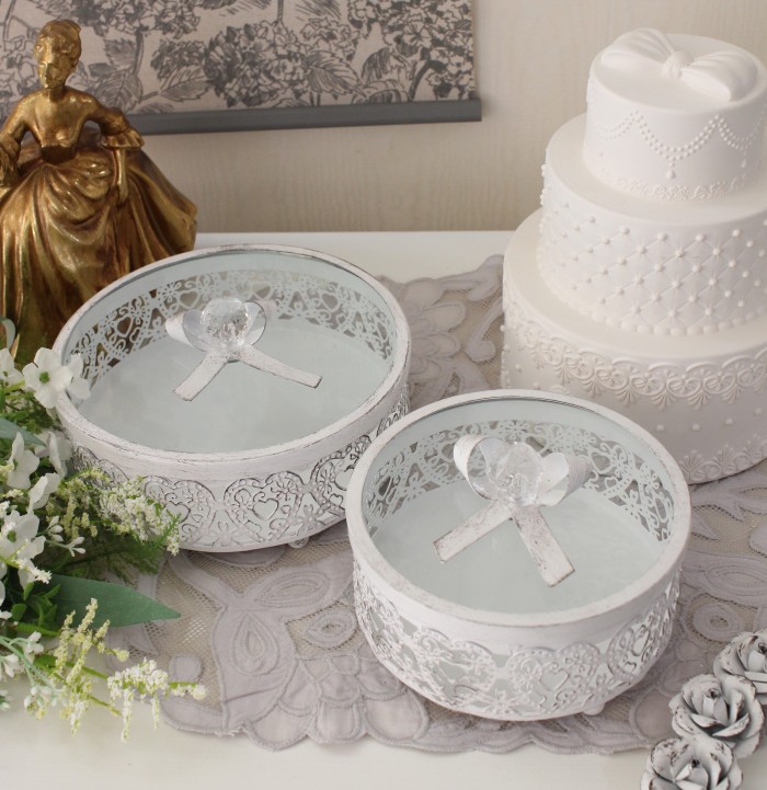 こちらはガラス蓋付きのジュエリーケース 2サイズ展開で小さい方のサイズです アンティーク風仕上げの色合いに、側面のハートレース模様や蓋のクリスタル付きリボンなど細かな装飾が目を惹きます