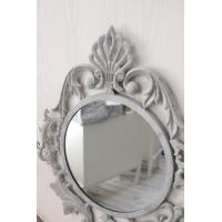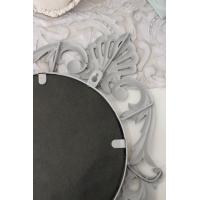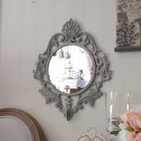 こちらはアイアン製の壁掛けミラー シャビーシックなグレーカラーです アンティーク加工が丁寧に仕上げられています 紋章のようなおしゃれなデザインと程よいサイズ感は壁面に彩を添えてくれます |
