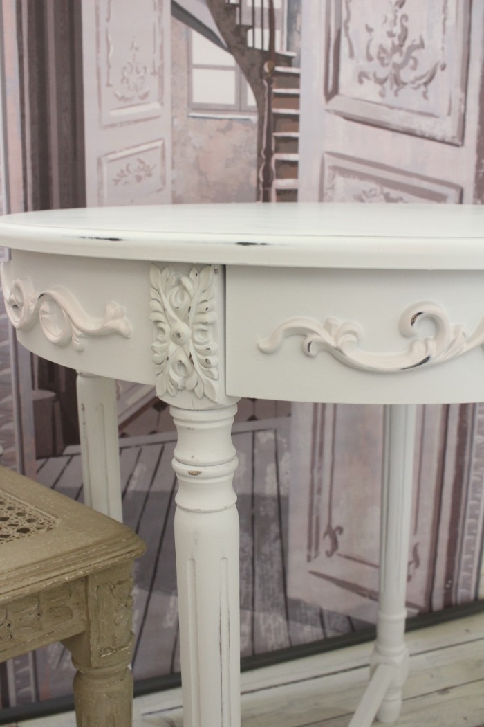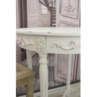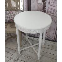 こちらは装飾の美しいホワイトカラーのラウンドテーブル 手の込んだアンティーク塗装は、色の剥がしや擦れなどが再現されて味わい深い雰囲気です 小ぶりなサイズ感は椅子と合わせてコーヒーテーブルのように使ったり、飾り台のように使用しても素敵です |