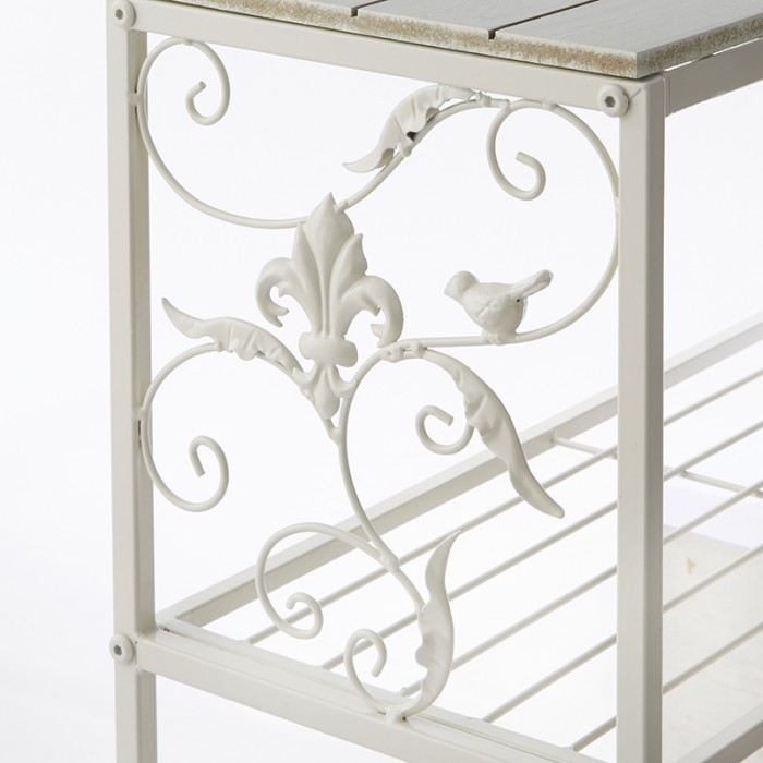 ヨーロピアンな雰囲気が素敵なアイアン製のプランタースタンド 天板は木製(MDF)となります ユリの紋章とバードのモチーフが可愛らしく、お花や植物・置物など沢山飾ってお楽しみ頂けます