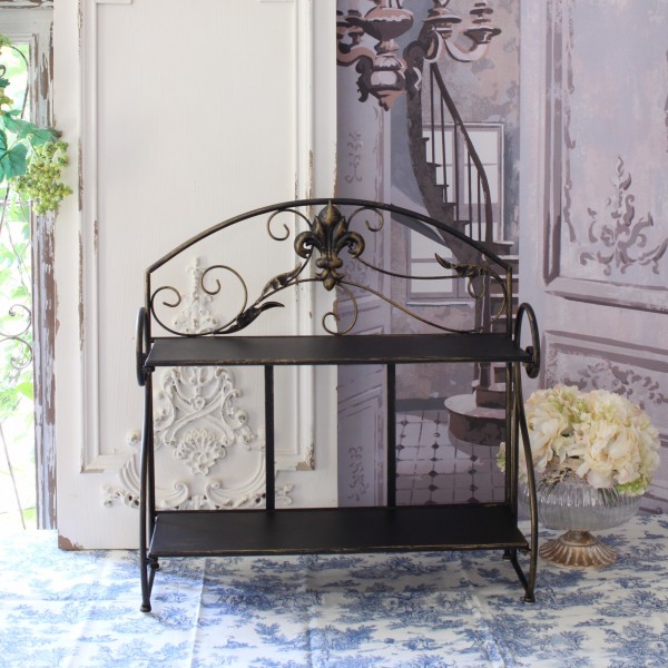商品説明 | ヨーロピアンな雰囲気が素敵なディスプレイラック アイアン製でお色はダークブロンズとなります 左右のパーツを正面にして頂き、棚板を下してはめて頂く仕様です
