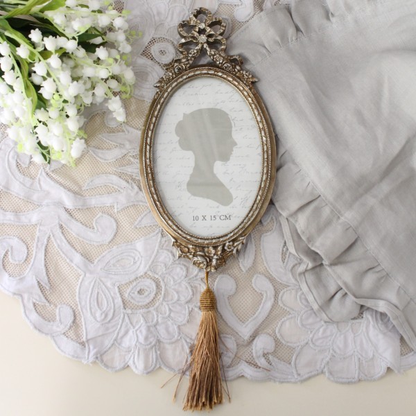 商品説明 | リボンとローズのモチーフにタッセルがアクセントになった壁掛けフレーム アンティーク風な雰囲気でインテリアにも馴染みやすい色合いです 大切なお写真、ハガキなどを飾って壁面のポイントにいかがでしょうか ※裏側に壁掛け金具が付いております |