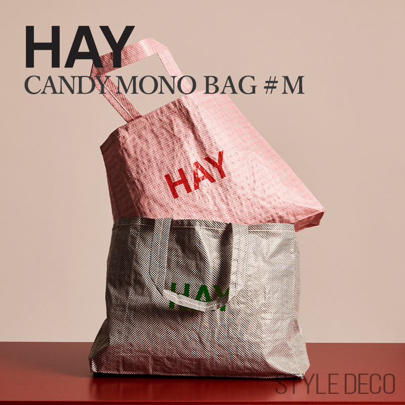 リサイクルプラスチックを80%使用した丈夫で耐久性の高い素材でできたCANDY MONO BAG。お買い物のほか、さまざまな日用品の持ち運びにぴったりな、カラフルで実用的なバッグです。HAYのロゴがコントラストの効いたカラーであしらわれています。