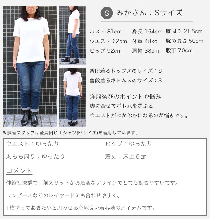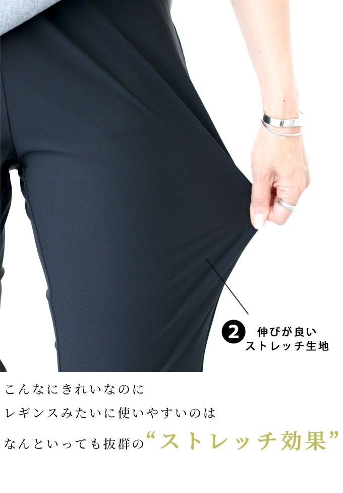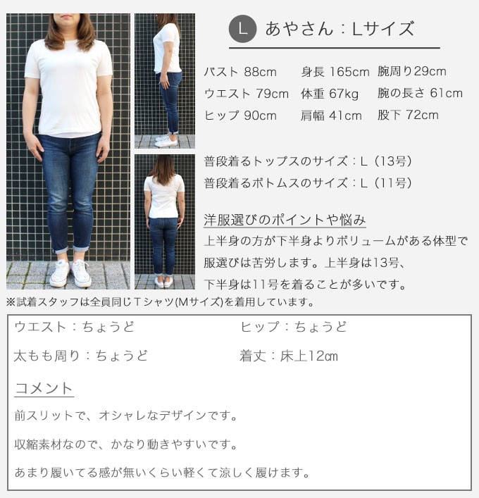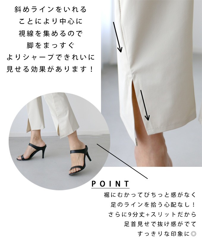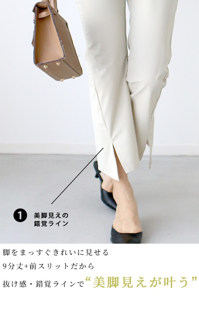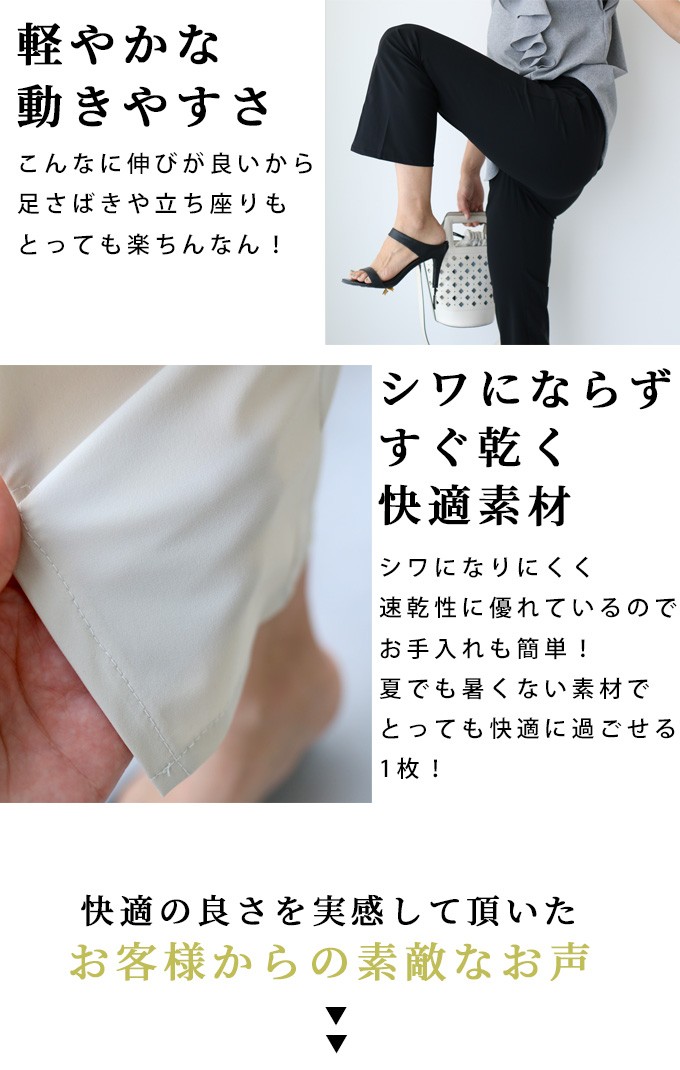 このシルエットとデザインに脱帽。 美脚見えNo.1の九分丈ストレッチパンツ 膝から下のラインを必ず美脚に導いて くれる計算されたシルエット。 脚長効果が狙える裾スリットカット& フェイクポケット。 足元にすっきり抜け感を作れる九分丈。 一度穿くとその美シルエットの虜に。 色違いで大人買いしたくなる 秘密が詰まった一本です。 POINT 大人女性がパンツに求めるのは この穿き心地! 穿いていてとっても楽な伸縮性、軽さと涼しさ。 伸縮自在なウエストゴム。 これら全部を兼ね備えた これからのシーズンにぴったりの 大人女性の為のストレッチパンツです。 生地感 サラッとフラット 薄く、ほどよくフィット& 心地良い伸縮性 フィット感のとても良い 薄手の素材です。 快適な伸縮性で、シルエットを キープしてくれます。 |