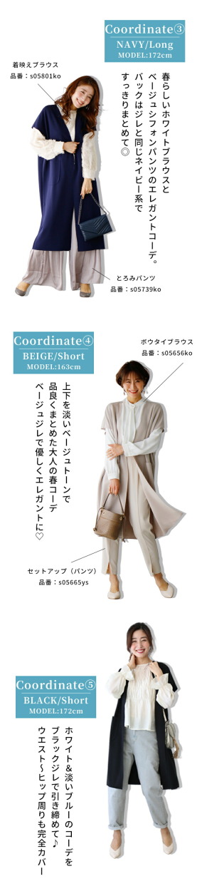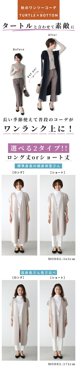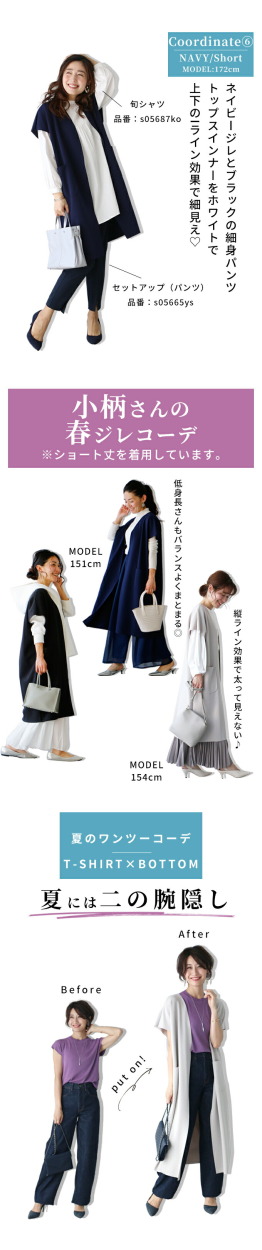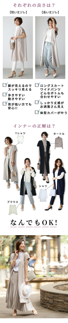 春はジレが大活躍!! 春の重ね着をするなら このジレ一点投入でこんなに素敵に♪ 色々楽しめちゃう? style流春のジレコーデご紹介♪ 小柄さんの春ジレコーデ 夏には二の腕隠し 秋にはタートルと合わせると素敵に 選べる2タイプ ロング丈orショート丈 |