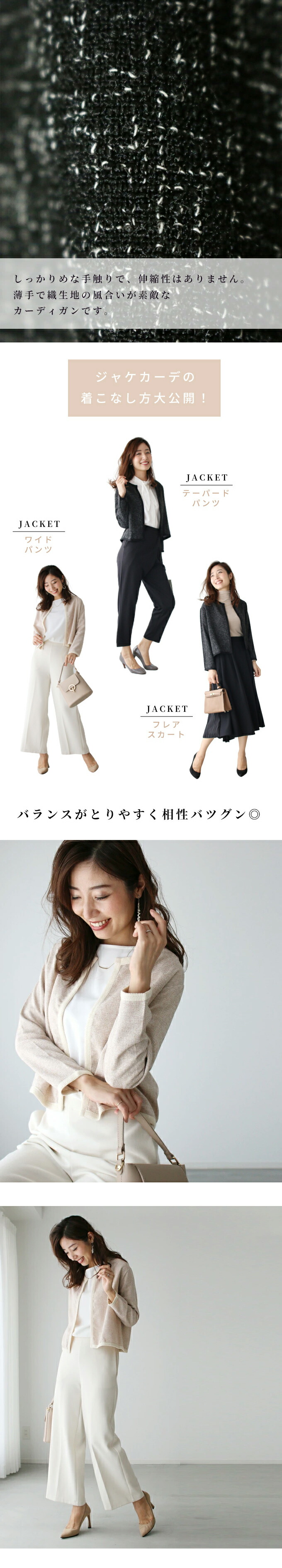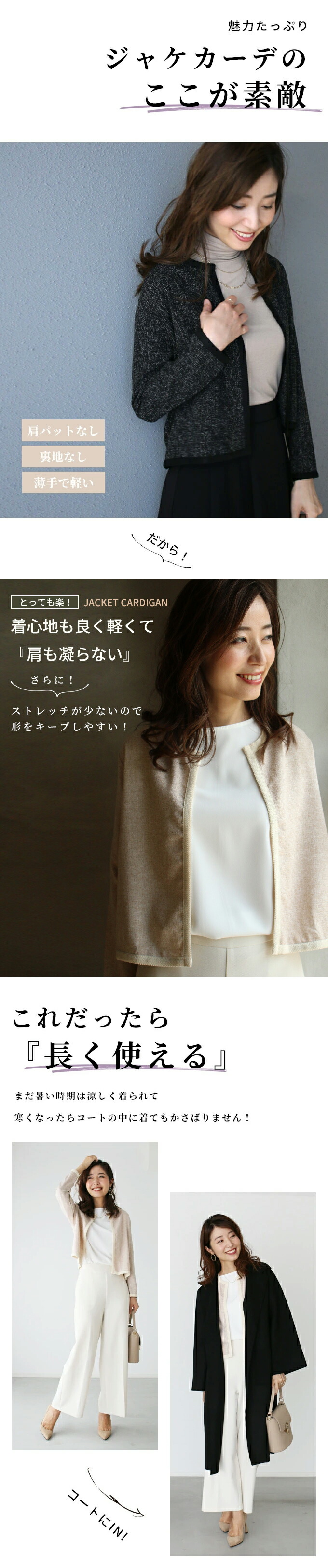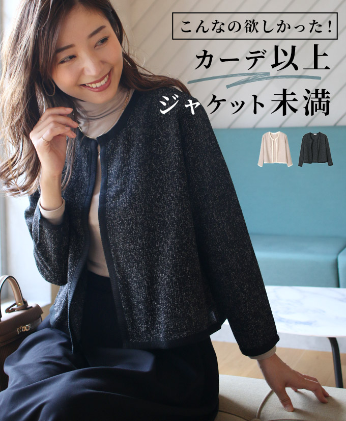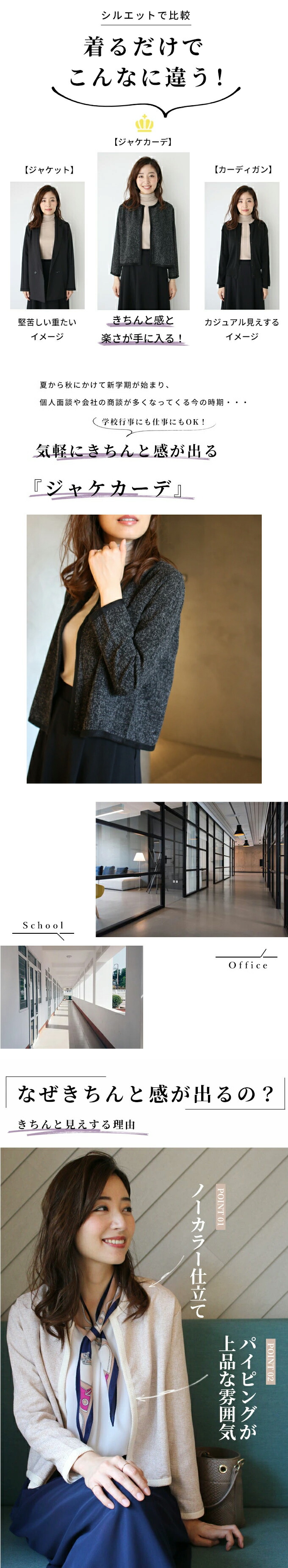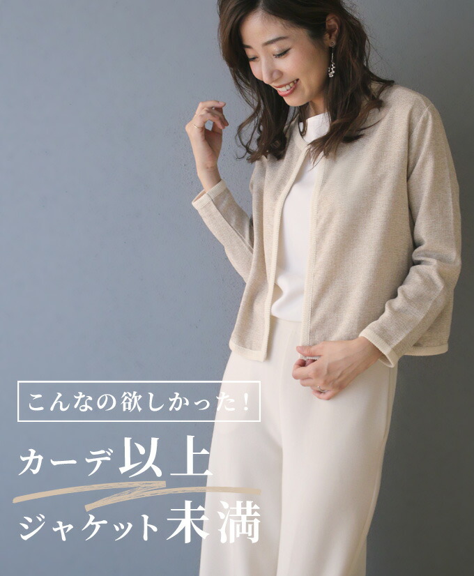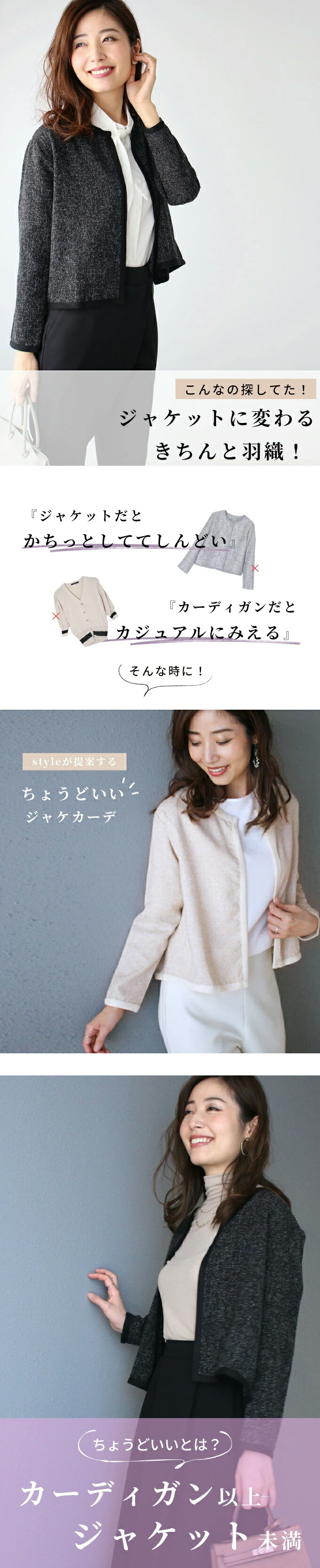 こんなの探してた! ジャケットに変わるきちんと羽織! 『ジャケットだとかちっとしててしんどい』 『カーディガンだとカジュアルにみえる』 そんな時に! styleが提案するちょうどいいジャケカーデ ちょうどいいとは? カーディガン以上ジャケット未満 夏から秋にかけて新学期が始まり、 個人面談や会社の商談が多くなってくる今の時期・・・ 学校行事にも仕事にもOK! 気軽にきちんと感が出る 『ジャケカーデ』 なぜきちんと感が出るの? ノーカラー仕立て パイピングが上品な雰囲気 首元がすっきりとした印象に なるので簡単にきれいめな着こなしに パイピングを施し華やぎ感&上品な印象に。 このインナー合わせが素敵 丸首・タートル・ボウタイ ※ VネックはNG!首元にスカーフを巻いて華やかに◎ ジャケット→堅苦しい重たいイメージ カーディガン→カジュアル見えするイメージ ジャケカーデ→きちんと感と楽さが手に入る! 魅力たっぷり ジャケカーデのここが素敵 肩パットなし・裏地なし・薄手で軽い だから!とっても楽! 着心地も良く軽くて『肩も凝らない』 さらに!ストレッチが少ないので 形をキープしやすい! これだったら『長く使える』 まだ暑い時期は涼しく着られて 寒くなったらコートの中に着てもかさばりません! しっかりめな手触りで、伸縮性はありません。 薄手で織生地の風合いが素敵な カーディガンです。 ジャケカーデの着こなし方大公開! テーパードパンツ・フレアスカート・ワイドパンツ バランスがとりやすく相性◎ |