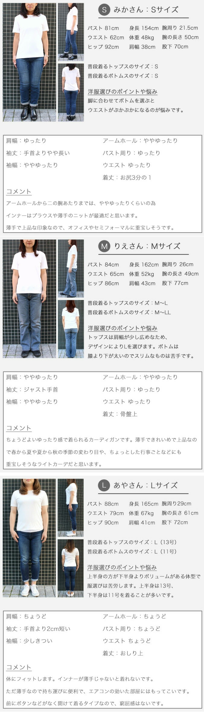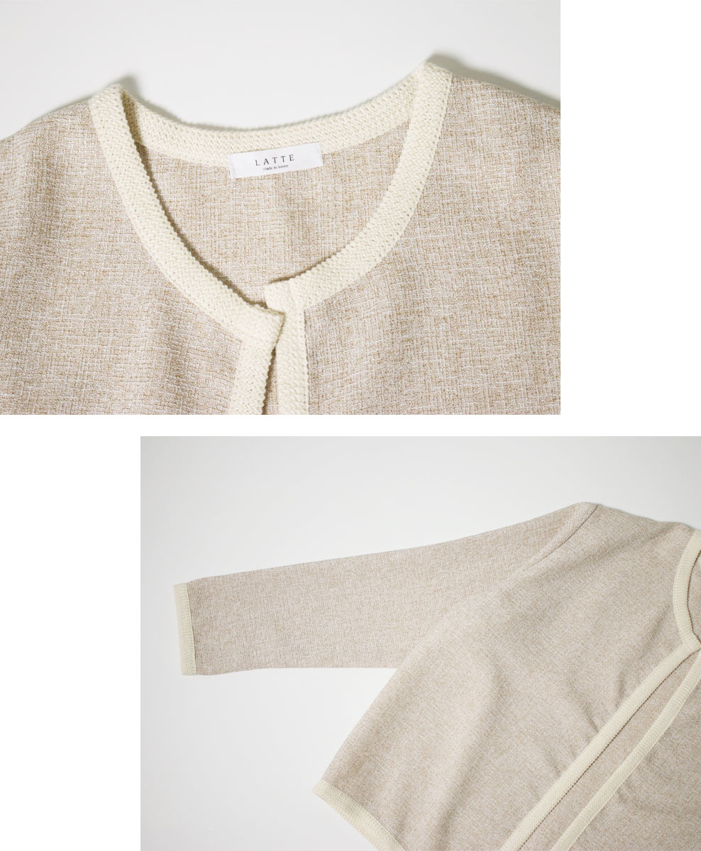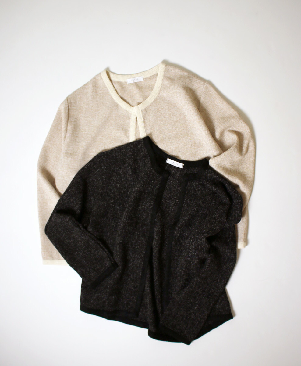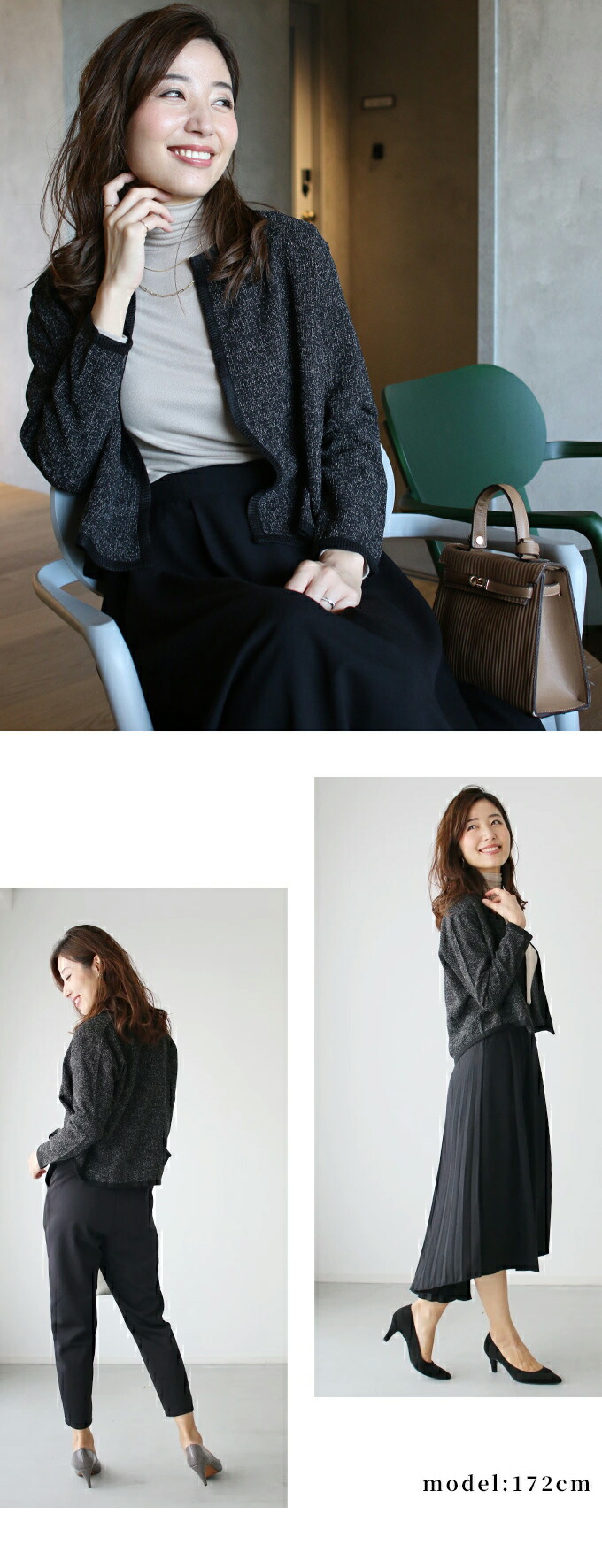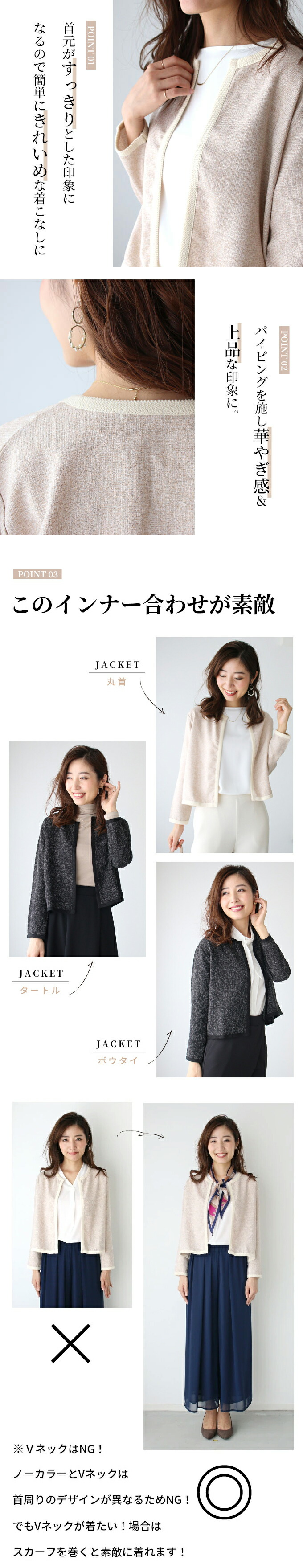こんなの探してた! ジャケットに変わるきちんと羽織! 『ジャケットだとかちっとしててしんどい』 『カーディガンだとカジュアルにみえる』 そんな時に! styleが提案するちょうどいいジャケカーデ ちょうどいいとは? カーディガン以上ジャケット未満 夏から秋にかけて新学期が始まり、 個人面談や会社の商談が多くなってくる今の時期・・・ 学校行事にも仕事にもOK! 気軽にきちんと感が出る 『ジャケカーデ』 なぜきちんと感が出るの? ノーカラー仕立て パイピングが上品な雰囲気 首元がすっきりとした印象に なるので簡単にきれいめな着こなしに パイピングを施し華やぎ感&上品な印象に。 このインナー合わせが素敵 丸首・タートル・ボウタイ ※ VネックはNG!首元にスカーフを巻いて華やかに◎ ジャケット→堅苦しい重たいイメージ カーディガン→カジュアル見えするイメージ ジャケカーデ→きちんと感と楽さが手に入る! 魅力たっぷり ジャケカーデのここが素敵 肩パットなし・裏地なし・薄手で軽い だから!とっても楽! 着心地も良く軽くて『肩も凝らない』 さらに!ストレッチが少ないので 形をキープしやすい! これだったら『長く使える』 まだ暑い時期は涼しく着られて 寒くなったらコートの中に着てもかさばりません! しっかりめな手触りで、伸縮性はありません。 薄手で織生地の風合いが素敵な カーディガンです。 ジャケカーデの着こなし方大公開! テーパードパンツ・フレアスカート・ワイドパンツ バランスがとりやすく相性◎ |