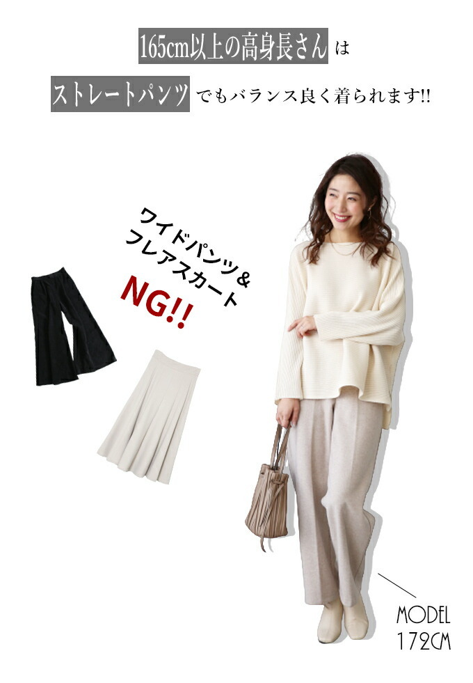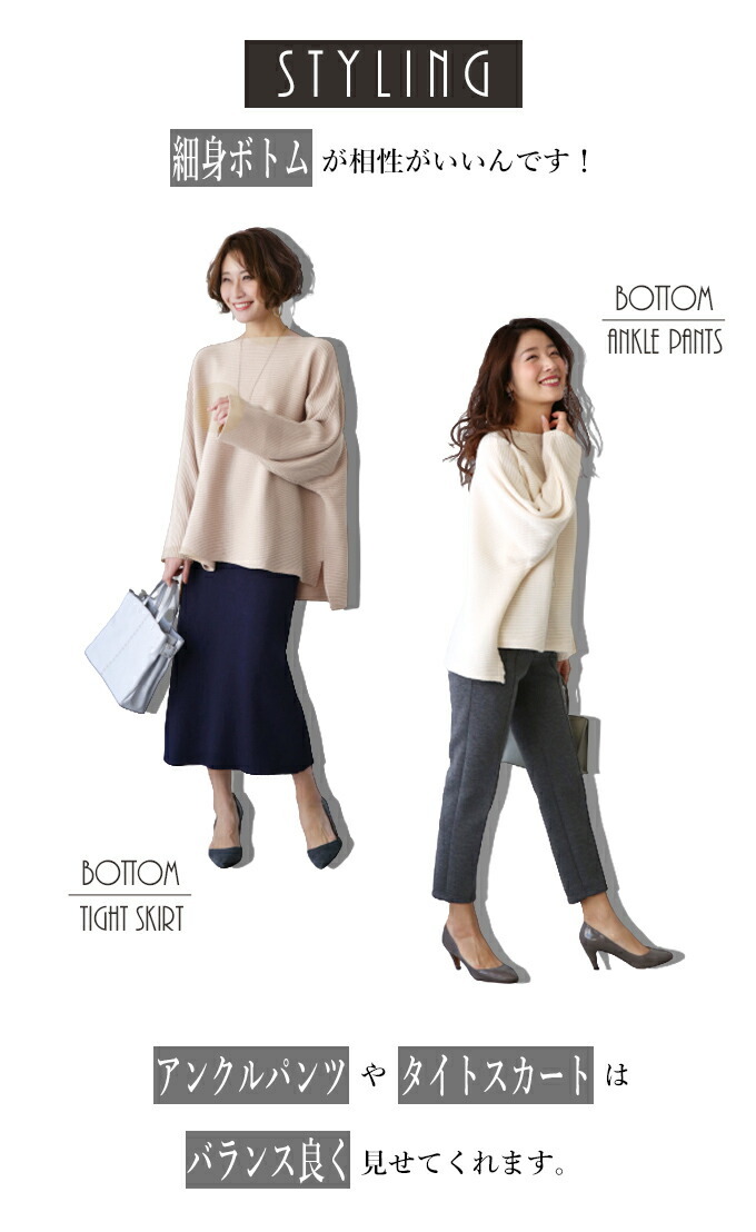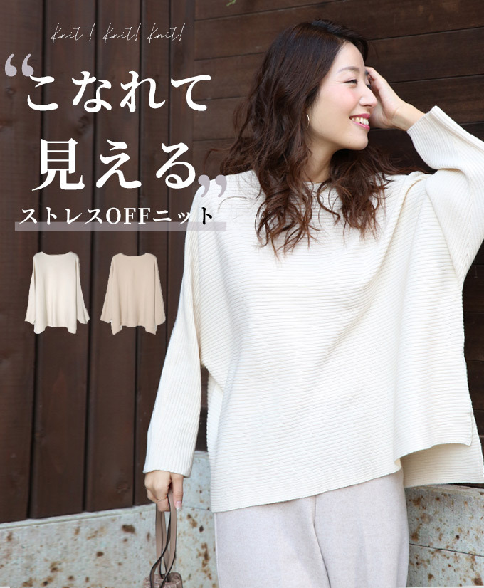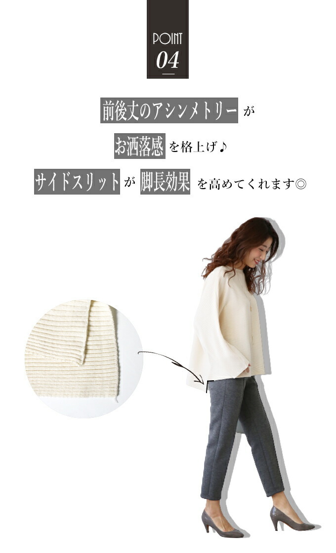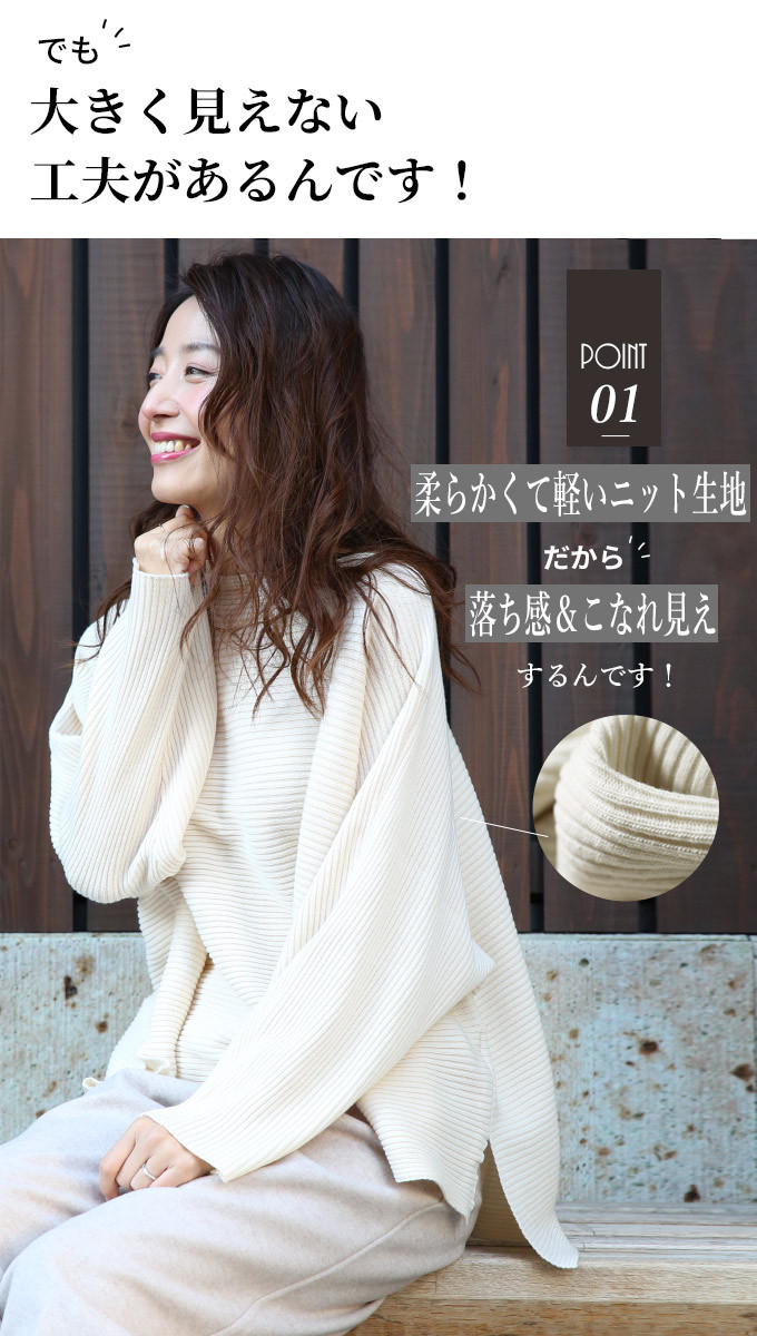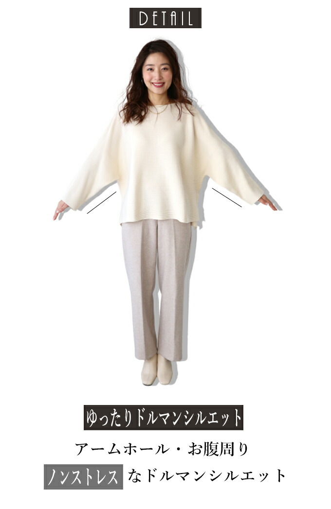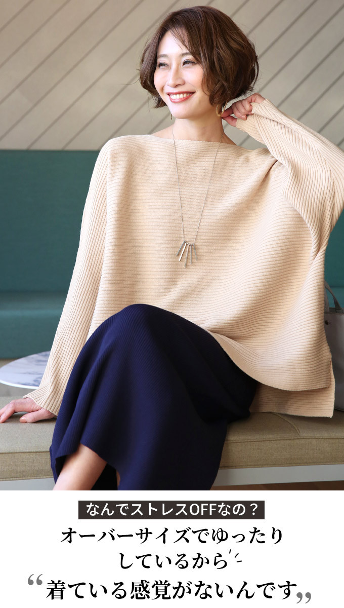 なんでストレスOFFなの? オーバーサイズでゆったりしているから 着ている感覚がないんです! でも大きく見えないような工夫があるんです! 1.柔らかくて軽いニット生地だから 落ち感&こなれ見えするんです! 2.横リブニットだけど 袖の切り替えがないから 手を下ろすと袖部分は縦リブ見えに だから太って見えないんです! さらに肩のラインがカバーされるので どんな肩幅の人でもキレイに着れちゃうんです! 3.ボートネックで首元すっきり 4.前後丈のアシンメトリーがお洒落感を格上げ♪ サイドスリットが脚長効果を高めてくれます◎ styling 細身ボトムが相性がいいんです! アンクルパンツやタイトスカートは バランス良く見せてくれます。 165cm以上の高身長さんは ストレートパンツではいてもバランス良く着られます! ワイドパンツフレアスカートはNG× Detail ゆったりドルマンシルエット アームホール・お腹周り ノンストレスなドルマンシルエット さらっとしたちくちくしない ニット素材です。 春先も着られる程よい厚みのニットです。 目の細かなリブ編みできちんと感があります。 長く愛用するためには 手洗いやドライでお洗濯し、 干すときは平干しをオススメします。 |