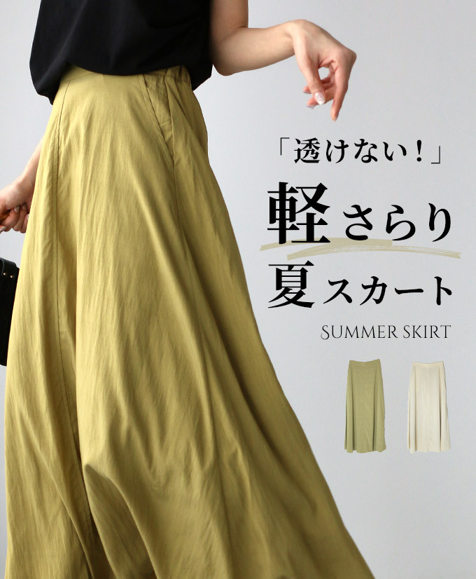 軽くてさらっとし 透けないロングスカート登場! 夏のスカートは薄くて透けやすい でも暑いから重たいスカートははきたくない。 そこで!薄い!軽い!透けない! 夏のロングスカートが誕生! POINT01 透けない理由 肌触りのいい裏地をしっかり膝下まで デザインしたので、生足の透け感を軽減しました。 ※スカートの色に合わせて裏地を選んでます。 POINT02 暑くないけど軽い生地感 トレンドを押さえた ナイロンレーヨン素材のスカート さらりとしたタッチと軽やかさが魅力◎ ナイロンの良さ 軽いのに丈夫!引っ張りや摩擦に強い シワになりにくい 伸び縮みせず型崩れしない レーヨン シルクに似た光沢・手触りが特徴 涼感があるので夏にぴったり その2つを掛け合わせた生地を たっぷりつかったロングスカート POINT03 シルエット 夏はロングが可愛い! 重たくならない素材なので ロング丈でも軽やかでお洒落な印象に 裾に向かって程よくフレアになっている 大人の広がりと落ち感が◎ ウエストゴムでラク! 低身長さんは少しヒールがあれば◎ シャリ感がありつつ歩くとふんわりなびく、 軽くて着やすい生地感です。薄手で涼しく、 きれいめな落ち感のある質感です。 ※アイロンするときは必ず当て布をして、 スチーム無しでアイロンして下さい。 着脱楽ちんチャックあり 深めポケット |