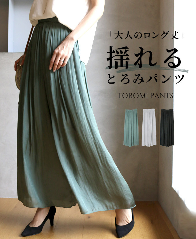 大人の女性らしい余裕を演出 一枚で華がある「揺れるツヤとろみパンツ」が登場! ココが良いPOINT01 『一枚で華がある』 柔らかく上品な光沢が特徴 一枚で華がある「揺れるツヤとろみパンツ」は きれいめに仕上げつつ適度な抜け感が 大人の女性らしい余裕を演出 ココが良いPOINT02 『たっぷり生地』 たっぷり生地を使うことで 歩くたびにフワッとしたきれいなシルエットに◎ さらに、脚のラインもカバー! ココが良いPOINT03 『ストレスフリー』 ウエストゴムとワイドシルエットで 履き心地はストレスフリー リラックス感のあるはき心地でお出かけにも リモートワークでも重宝◎ ココが良いPOINT04 『ワイドシルエット』 ワイドシルエットのパンツは、 ロングスカート感覚ではけるのでコーデしやすい◎ スカート派・パンツ派のどちら方もOK! 本当に穿いてる!? 超軽量!たったの135g ★コーデカラー別 上品で大人には嬉しい絶妙なくすみカラー このカラーなら夏からロングシーズン使いやすい 涼しくてくすみカラーなので長いシーズン着られる 涼しくたっぷりの揺れをつくる軽い素材 ※繊細でデリケートな素材なのでヒールなどのひっかけに注意 透け防止のためペチパンツを着るのが必須! |