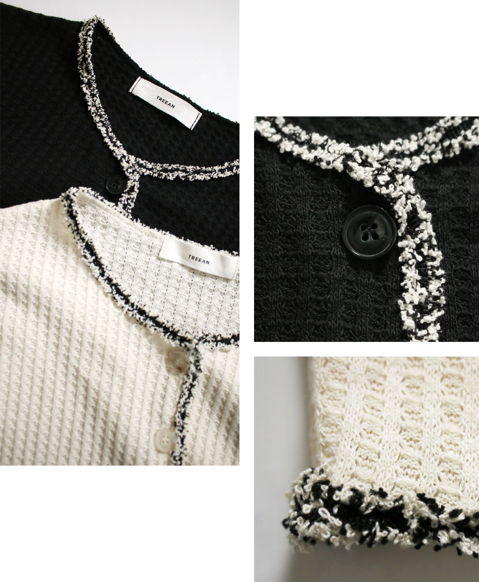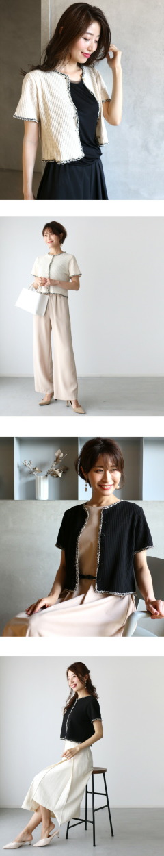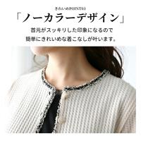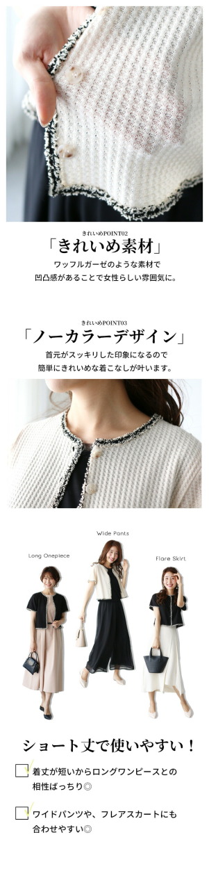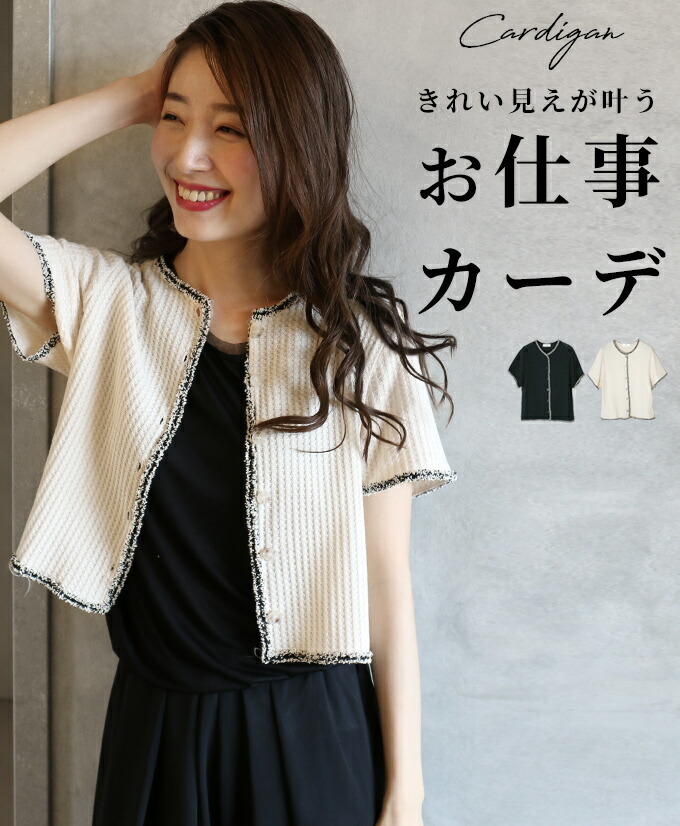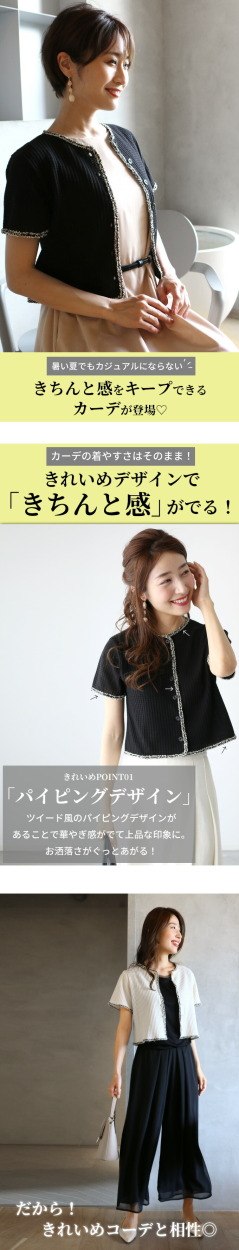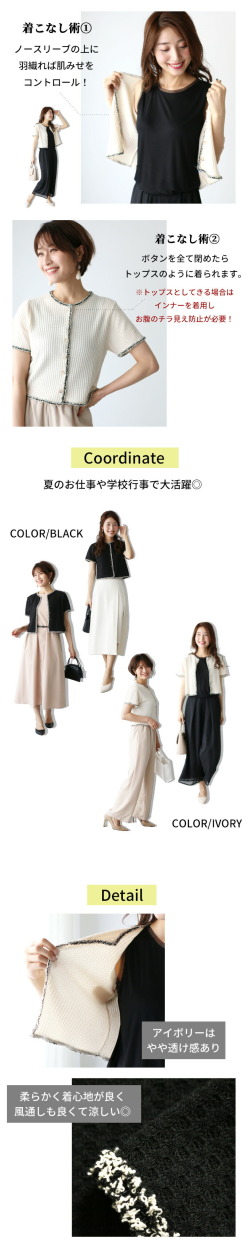 暑い夏でもカジュアルにならない きちんと感をキープできるカーデが登場♪ カーデの着やすさはそのまま! きれいめデザインできちんと感がでる! きれいめPOINT01 「パイピングデザイン」 ツイード風のパイピングデザインが あることで華やぎ感がでて上品な印象に。 お洒落さがぐっとあがる! だから!きれいめコーデと相性◎ きれいめPOINT02 「きれいめ素材」 ワッフルガーゼのような素材で 凹凸感があることで女性らしい雰囲気に。 きれいめPOINT03 「ノーカラーデザイン」 首元がスッキリした印象になるので 簡単にきれいめな着こなしが叶います。 ショート丈で使いやすい! ・着丈が短いからロングワンピースとの相性ばっちり ・ワイドパンツや、フレアスカートにも合わせやすい 着こなし術! ・ノースリーブの上に羽織れば、肌みせをコントロール ・ボタンを全て閉めたらトップスのように着れる ・トップスとしてきる場合はインナーを着用し お腹のチラ見え防止が必要! 夏のお仕事や学校行事でも活躍 アイボリーはやや透け感あり 柔らかく着心地が良く 風通しも良くて涼しい◎ |