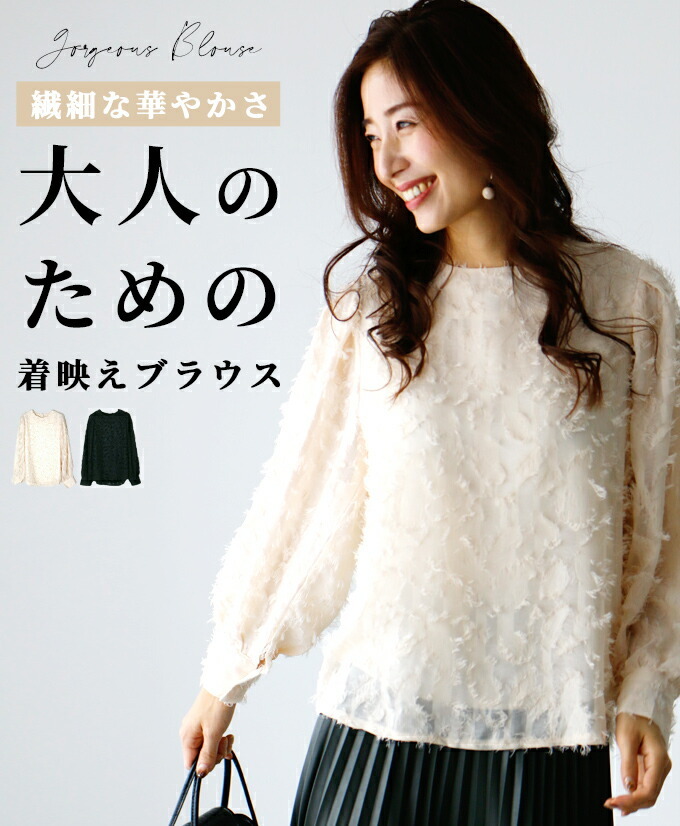 ちょっと気分を盛り上げたいときや 華やかなシーンには欠かせない 1枚で着映えるブラウス? 主役級POINT 「フリンジレース」 シャイニーなフリンジレースが目を惹く 主役級のブラウスは、 若作りしすぎず、老けこまない 大人にちょうどいい華やかさで仕上げました。 「シースルー」 腕部分はシースルーデザイン ほんのり肌の透け感がブラウスの軽やかさと 合わさり上品に 大人が着やすいサイズ感&ゆるさ 「バランスの良い丈感」 見た目のインパクトだけでなく、アウトしたままでも バランスよく着られるような絶妙な丈感 「ゆるっとサイズ」 程よくゆるさのあるサイジング 気になる二の腕やお腹周りもカバーしてくれます。 ブラウス自体にデザイン性があるから ボトムスを合わせるだけで オシャレが完成◎ 「オケージョンシーンにも活躍」 フリンジがフワフワとしたフェザーのように見え 存在感のあるデザインで アクセサリーやボトムがシンプルでも パッと目を引くオケージョンコーデになります。 とても繊細な生地で出来ています。 お洗濯や着脱の際の引っ掛けには十分ご注意ください。 |