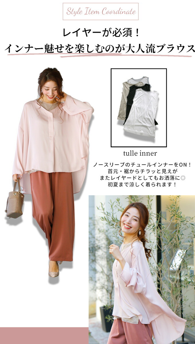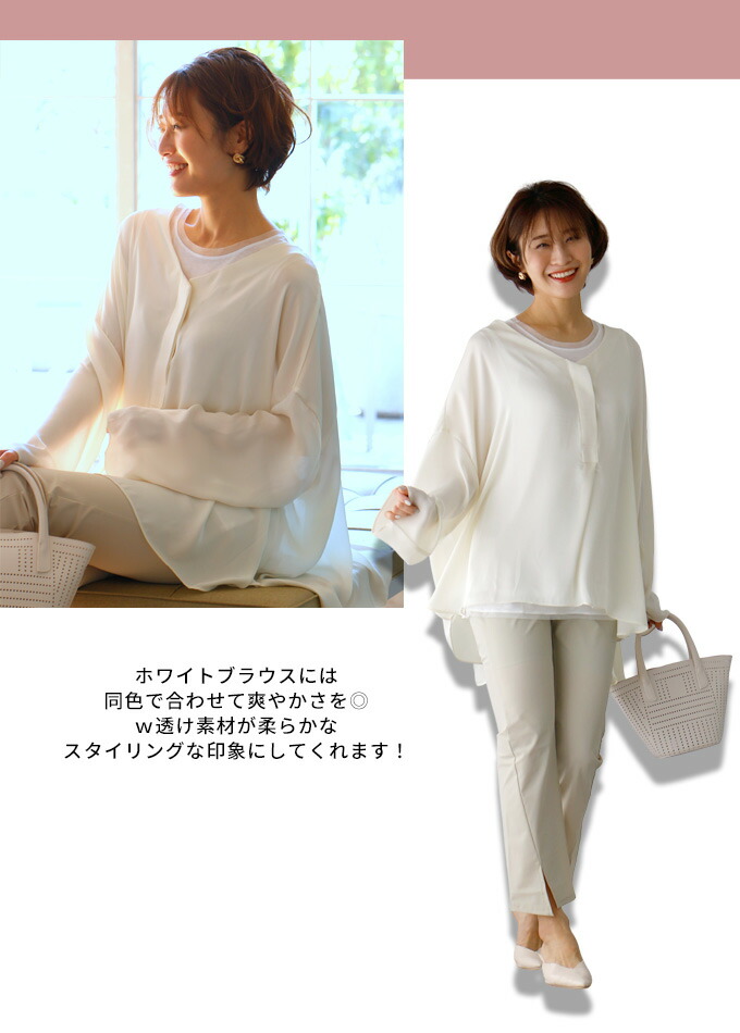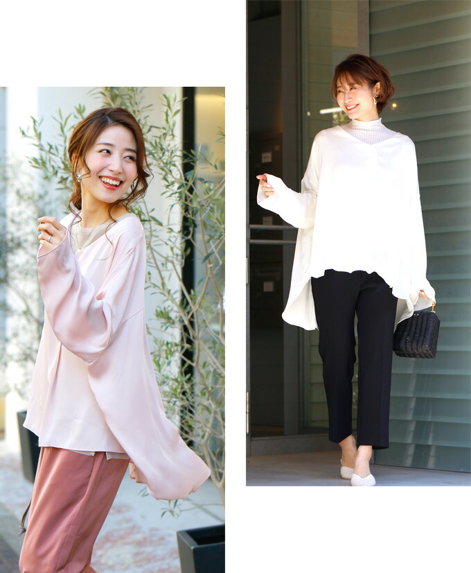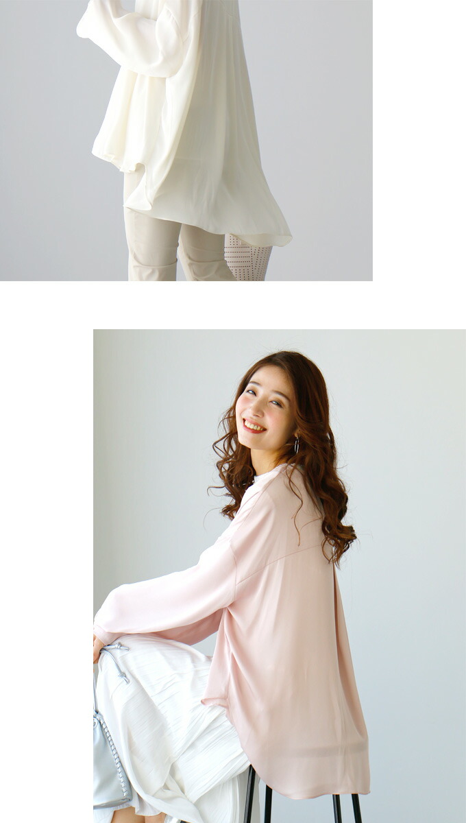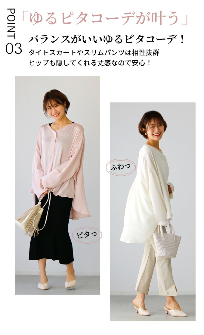カジュアル要素があるきれいめ感 リラックスできる大人オーバーブラウス 大人の休日ブラウス登場 レイヤーが必須! インナー魅せを楽しむのが大人流ブラウス! 1枚では着ない!コーデ楽しむのが◎ 大人カジュアル必須point 『揺れ感と艶感』 オーバーサイズ感と きれいめ、艶っぽさが必要! 揺れ感と艶感があるブラウスで 超オーバーサイズだから さらにゆったり感が増して◎ 生地感がとろとろサラサラで 落ち感もつくってくれてます。 『バックスタイルの拘り』 抜け感を作るネックライン! 前後で大きく開いたネックラインデザイン ちょうどいい女性らしいシルエットを作ってくれます! バックにはタックがあることで うしろに流れる落ち感の動きを さらに美しくしてくれます◎ 『ゆるピタコーデが叶う』 バランスがいいゆるピタコーデ! タイトスカートやスリムパンツは相性抜群 ヒップも隠してくれる丈感なので安心! 袖ロールアップでポワン感を演出 |