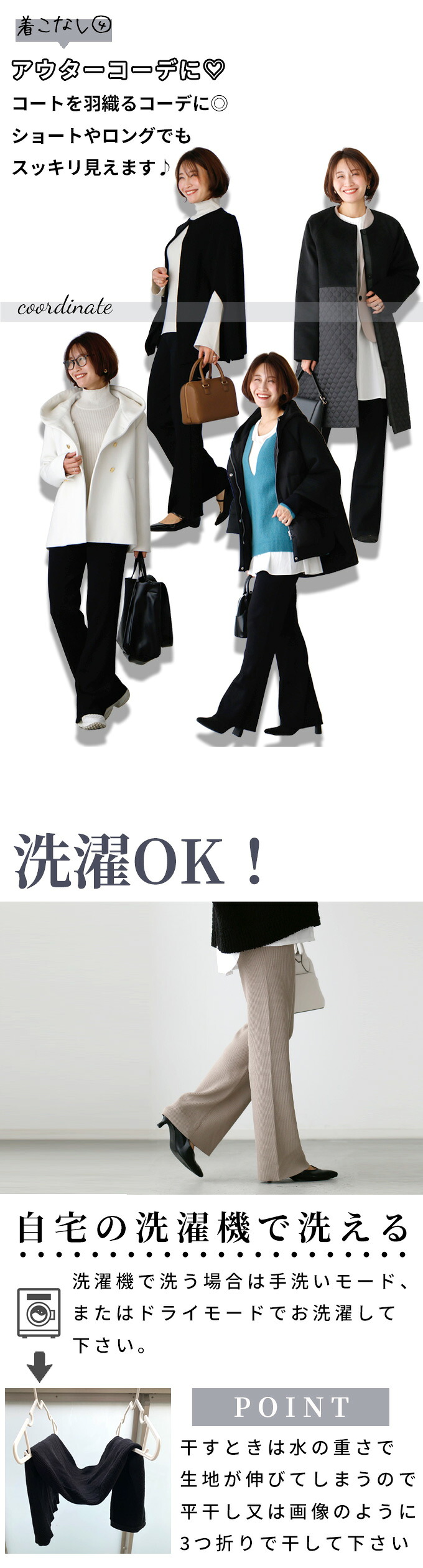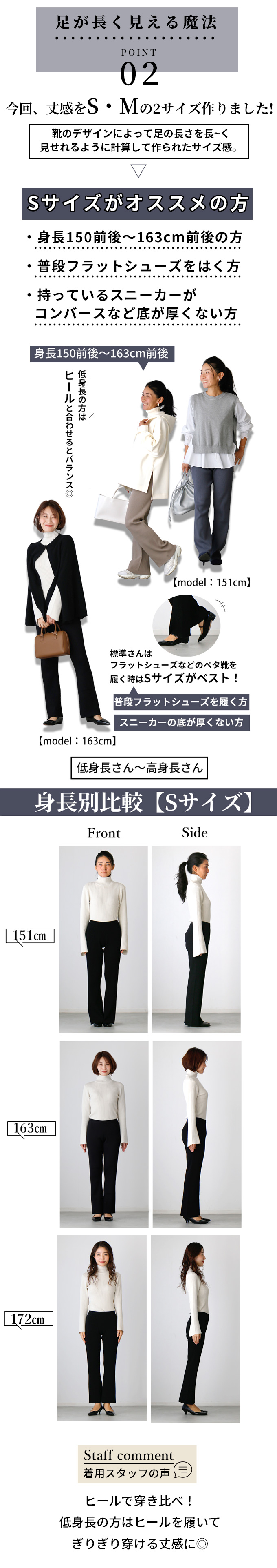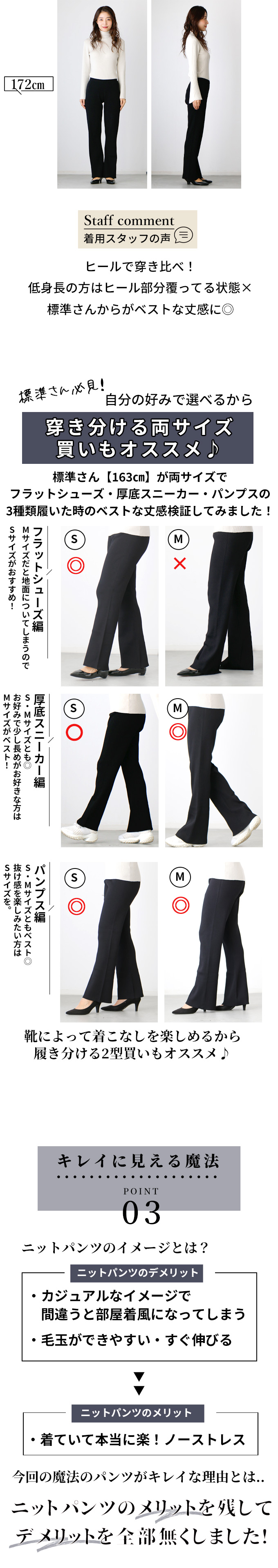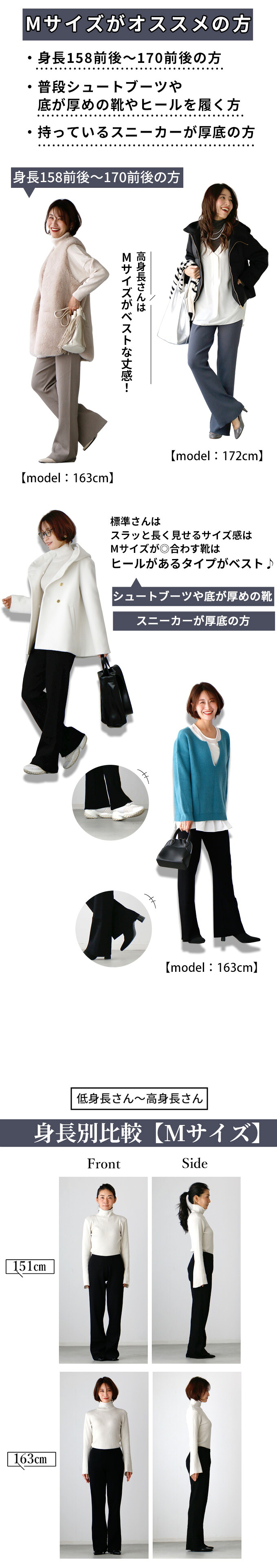 【Sサイズ】 ウエスト 62-94cm(ゴム) 股上 23cm 総丈 93cm ヒップ 84cm 渡り幅 25cm 裾幅 23cm 重さ 約498g 【Mサイズ】 ウエスト 64-100cm(ゴム) 股上 25cm 総丈 99cm ヒップ 88cm 渡り幅 25cm 裾幅 24cm 重さ 約506g サイズの測り方につきましては統一しておりますが、 2〜3cm程度の誤差が生じる場合や、生産時期によりサイズが多少異なる場合がございます。 何卒ご了承くださいませ。