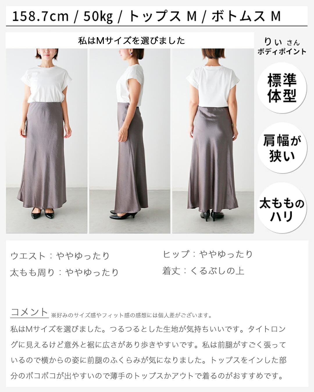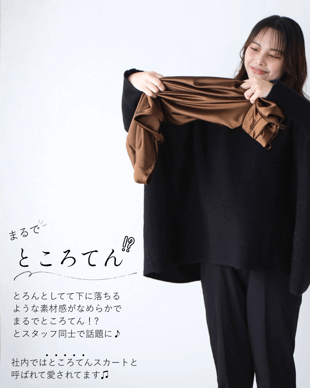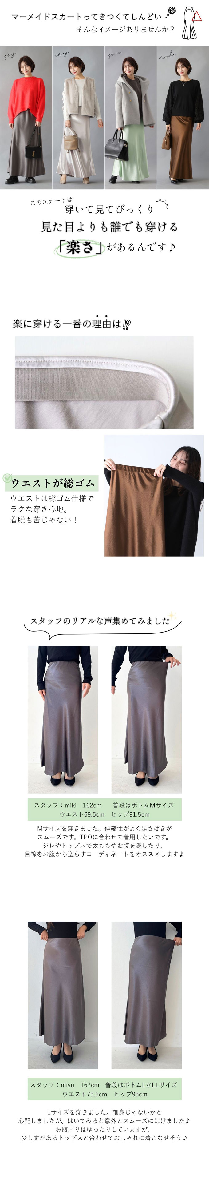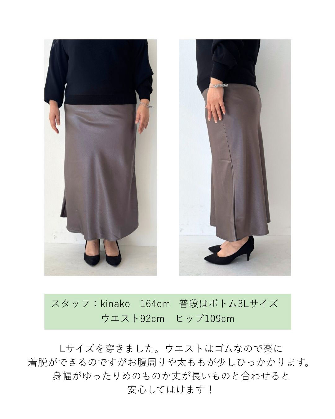 【Mサイズ】 総丈 97cm ウエスト 66-94cm(ゴム) ヒップ 80cm 裾幅 80cm 【Lサイズ】 総丈 98cm ウエスト 70-98cm(ゴム) ヒップ 84cm 裾幅 80cm サイズの測り方につきましては統一しておりますが、 2〜3cm程度の誤差が生じる場合や、生産時期によりサイズが多少異なる場合がございます。 ニット商品は、伸縮する素材のため 通常の2〜3cm誤差よりも誤差範囲が大きくなる可能性がございます。 何卒ご了承くださいませ。