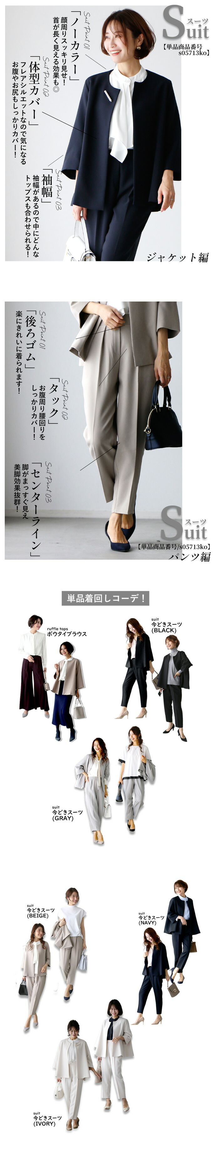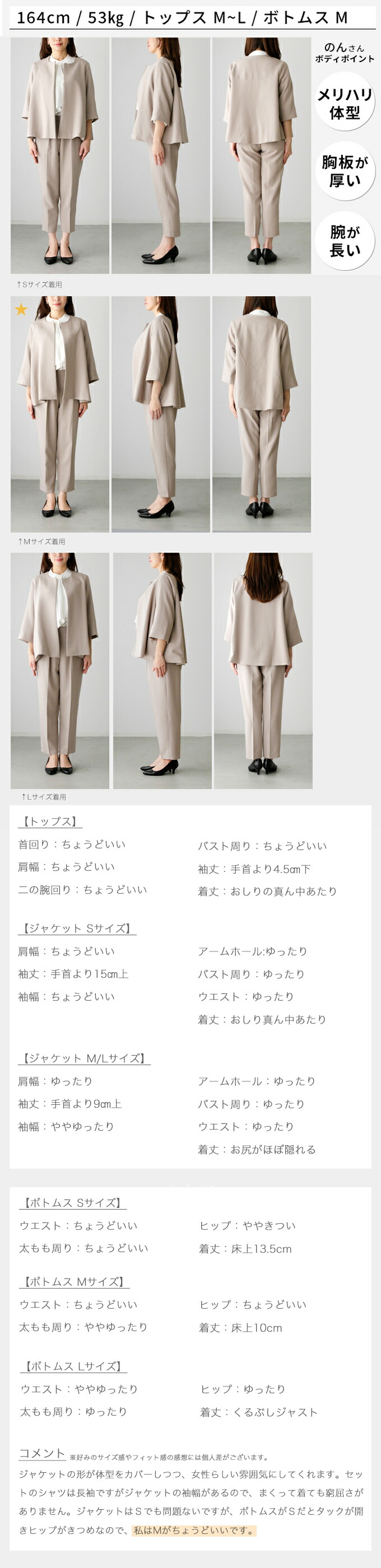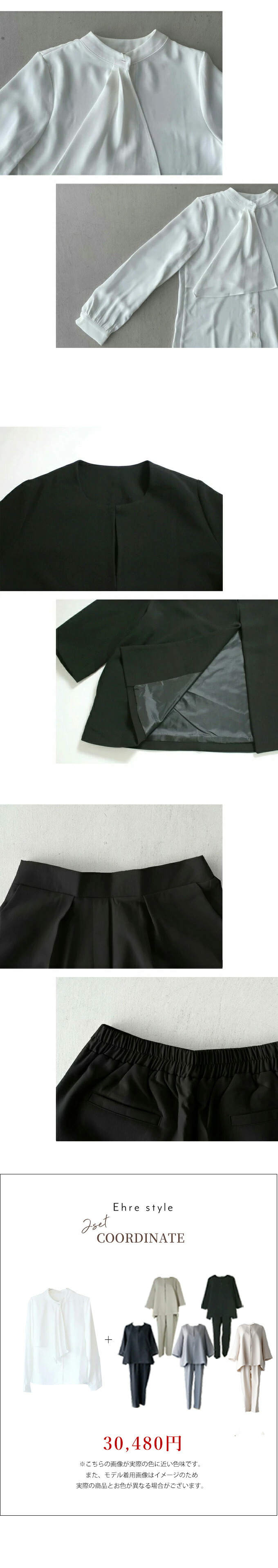 【ジャケット】 素材 ポリエステル 77% ・ レーヨン 18% ・ ポリウレタン 5% 厚み なし 伸縮性 なし 透け感 なし 裏地 あり 重さ (S)約480g(M・L)約495g ポケット あり 手洗い 可 メール便 不可 生産国 韓国 【パンツ】 素材 ポリエステル 77% ・ レーヨン 18% ・ ポリウレタン 5% 厚み なし 伸縮性 ややあり 透け感 なし 裏地 なし 重さ (S)約340g(M)約335g(L)約360g ポケット あり(フェイクポケット(後)あり) 手洗い 可 メール便 不可 生産国 韓国 | |