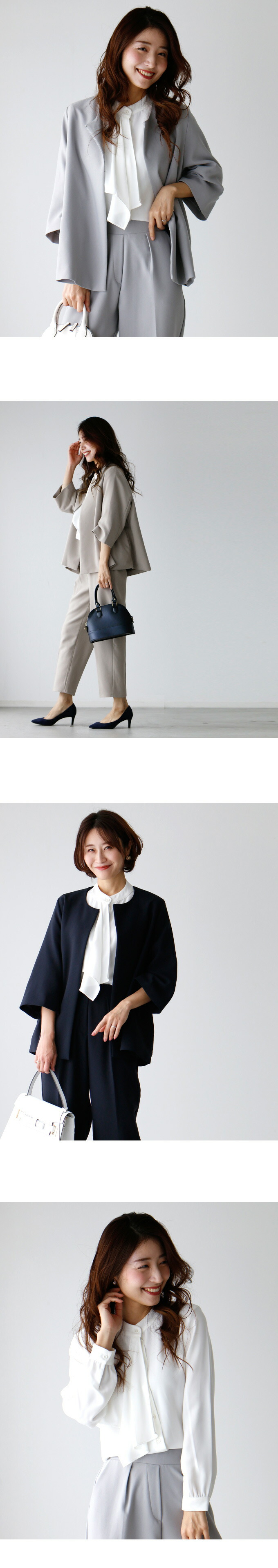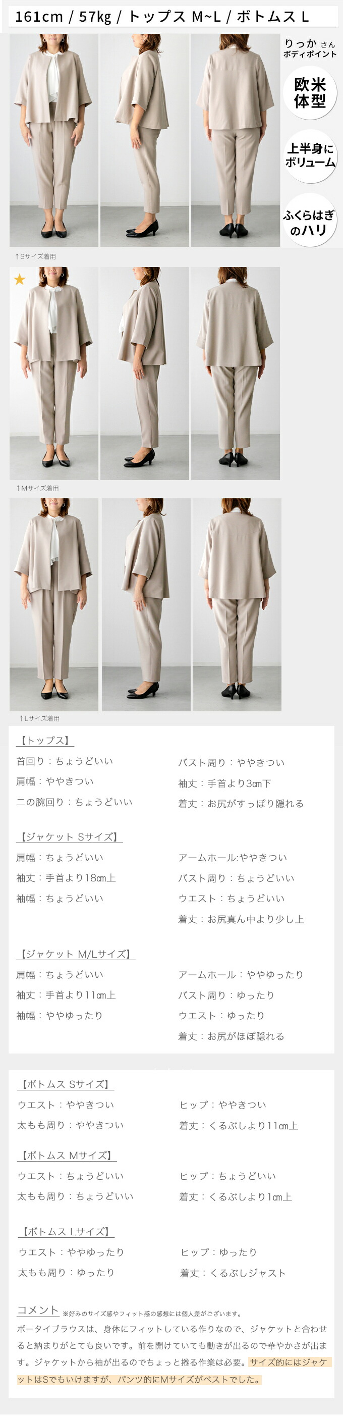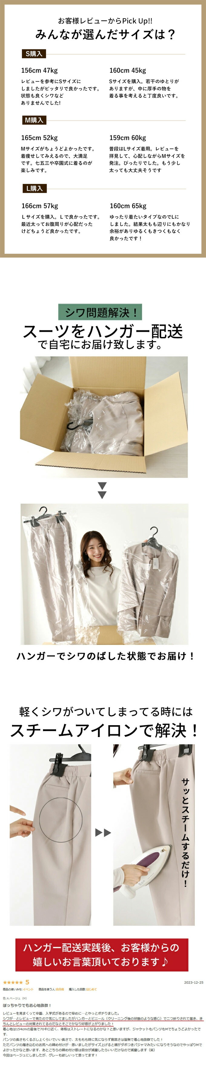 【ジャケット】 素材 ポリエステル 77% ・ レーヨン 18% ・ ポリウレタン 5% 厚み なし 伸縮性 なし 透け感 なし 裏地 あり 重さ (S)約480g(M・L)約495g ポケット あり 手洗い 可 メール便 不可 生産国 韓国 【パンツ】 素材 ポリエステル 77% ・ レーヨン 18% ・ ポリウレタン 5% 厚み なし 伸縮性 ややあり 透け感 なし 裏地 なし 重さ (S)約340g(M)約335g(L)約360g ポケット あり(フェイクポケット(後)あり) 手洗い 可 メール便 不可 生産国 韓国 | |
