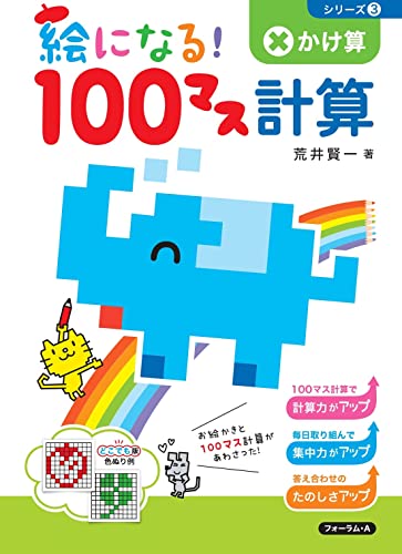 基礎計算の習熟法として有名な100マス計算に、“絵が出る”おまけをつけたドリル かけ算編。 計算したあとに、指定された答えのマスをぬって、絵を完成させます。 ・100マス計算をした後どんな絵になるか楽しみがある。 ・終わらせて色ぬりしようと計算がはやくなる。 ・絵をぬることで自然と応え合わせができる。 家庭や学校で「おまけ効果」を存分に活用してください
