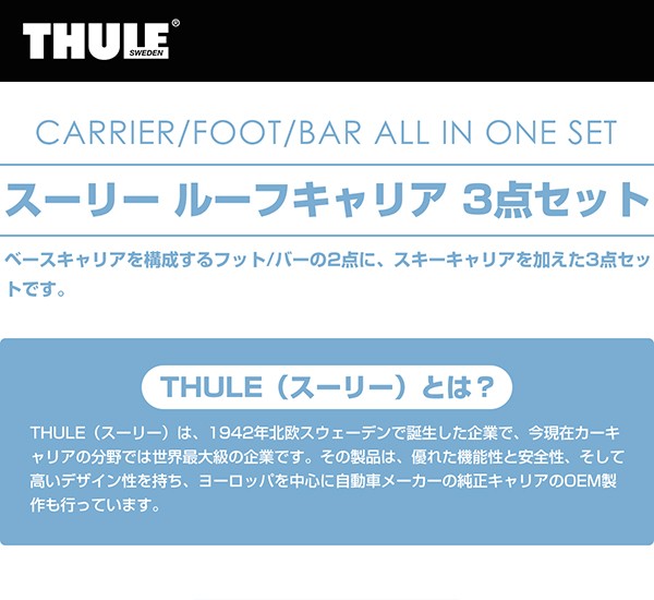 | フット/バー/スキーキャリアを1セットにしたTHULE(スーリー)のルーフキャリアセットです。 |