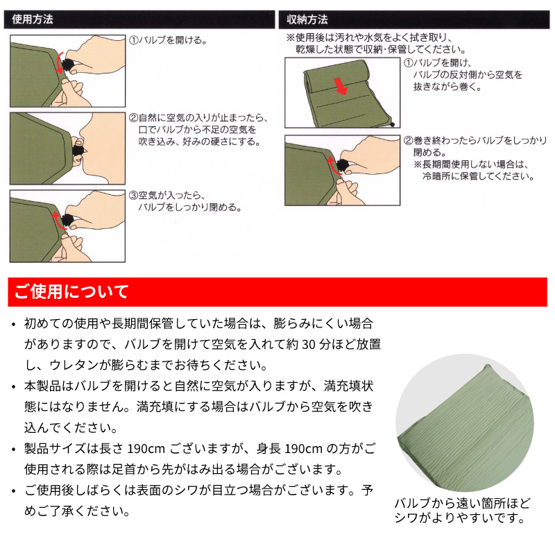 ●本製品はバルブを開けると自然に空気が入りますが、満充填状態にはなりません。満充填にする場合はバルブから空気を吹き込んでください。