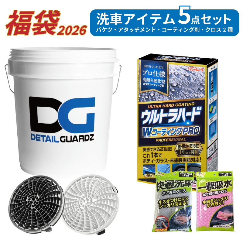 | こちらの商品は ●ディテールガーズ 18Lバケツ(ホワイトタイプ) ●ディテールガーズ ダートロック(ホワイトorブラック) ●リンレイ ウルトラハード WコーティングPRO ●ワコー ボア洗車クロス ●ワコー 拭き取り用クロス 5点がセットになった商品です。 お買い求めの際にはあらかじめセット内容をご確認の上、お買い求めください。 ●ディテールガーズ 18Lバケツ(ホワイトタイプ) 【DETAIL GUARDZ ジャパンオリジナル!高品質な洗車バケツ】 ディテールガーズジャパンオリジナルの洗車用バケツです。 日本製・高品質なバケツで「ダートロック バケツフィルター」がしっかりフィットするサイズ感となっております。 ●ディテールガーズ ダートロック(ホワイトorブラック) 【バケツに設置して洗車キズをゼロへ!】 ダートロックは洗車キズの元となる洗車ミットやスポンジなどに付着たゴミや砂利、鉄粉などを取り除き、バケツ下に閉じ込める画期的な洗車用具です。 通常、洗車ミットなどに付着たゴミや砂利は大切なボディーに傷を付けてしまいますが、特許取得済みの特殊形状フィルターでゴミや砂利の浮上を軽減! ●リンレイ ウルトラハード WコーティングPRO 【専門店のコーティングに迫る深いツヤ】 ウルトラハードWコーティングPROは、空気中の湿気と反応し硬化した被膜が密着し、 かつてない深みと鏡面のような美しい透明感を長期に渡り維持します。 白系・黒系・メタリックなどあらゆるボディカラーに対応しており、施工後の輝きは新車のような印象を与えます。 ●ワコー ボア洗車クロス 毛足の長いボアが毛の奥に汚れを取り込んで、細かな汚れもしっかり落としてくれる洗車クロスです。 細かいボアクロスの為、洗車時に車に傷をつけにくく、スポンジでは洗いにくい場所やコーティング施工車もしっかりガッツリ洗うことができます! ●ワコー 拭き取り用クロス 髪の毛の1/10の極細繊維でしっかり吸水! マイクロファイバー特有の極細繊維の毛細管現象による優れた吸水力で水滴をしっかり拭き取ります。 繊維が細かくキズを付けにくいクロスとなっている為コーティング車にも最適です! 凹凸のある織加工をしたクロスとなっておりますので、入り組んだ部分の水だってしっかり吸水してくれます! 洗車 ツール carwash_tool |