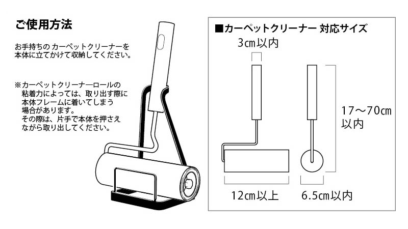 【対応サイズ】カーペットクリーナーのハンドル幅:約3cm以内 カーペットクリーナーのロール幅:約12cm以上、直径:約6.5cm以内 カーペットクリーナーの高さ:約17〜70cm以内を目安にしています。