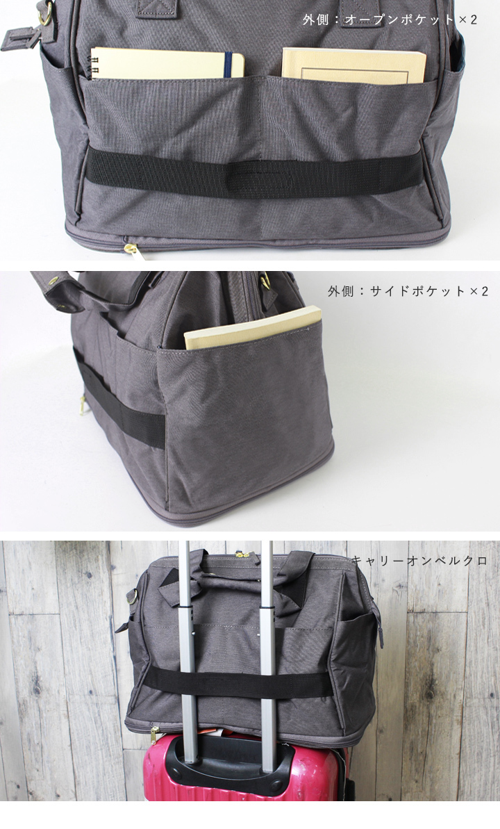 外側:ファスナーポケット×1、オープンポケット×2、サイドポケット×2、キャリーオンベルクロ