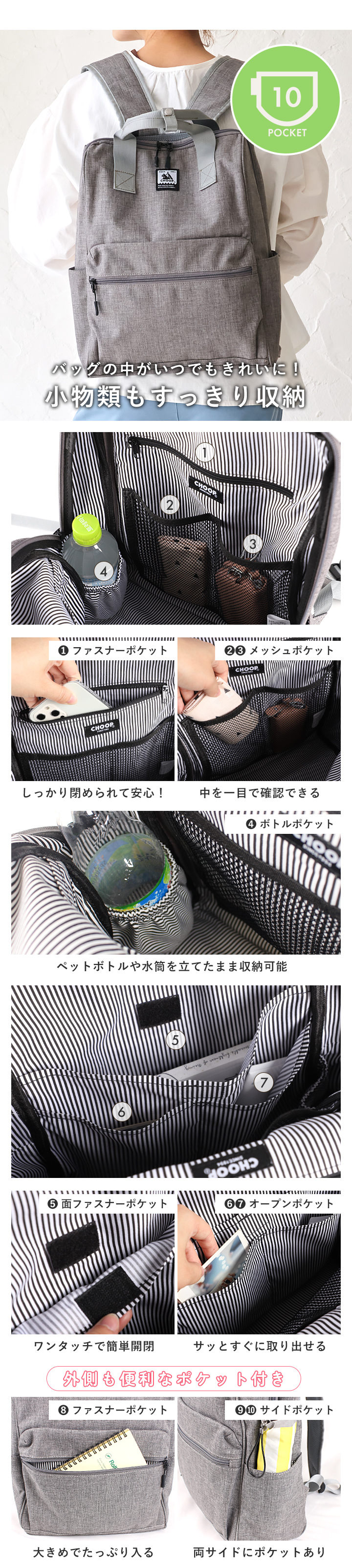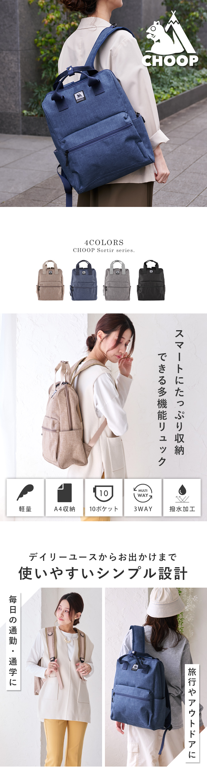 <関連キーワード>春 夏 秋 冬 おしゃれ お洒落 オシャレ かわいい 可愛い お出かけ 買い物 トレンド 人気 流行 カジュアル オフィスカジュアル 機能的 便利 通勤 通学 学生 高校 大学 ビジネス 職場 仕事 出張 普段使い 旅行 旅 トラベル 主婦 ママ レディース メンズ スタイルオンバッグ style on bag CHOOP シュープ りす リス アニマル 動物 リュック リュックサック 鞄 かばん カバン デイリーバッグ 撥水 撥水加工 はっ水加工 多機能 多収納 マチ広 自立 A4 A4サイズ 持ち手 ポケット PC収納 大きめ 軽量