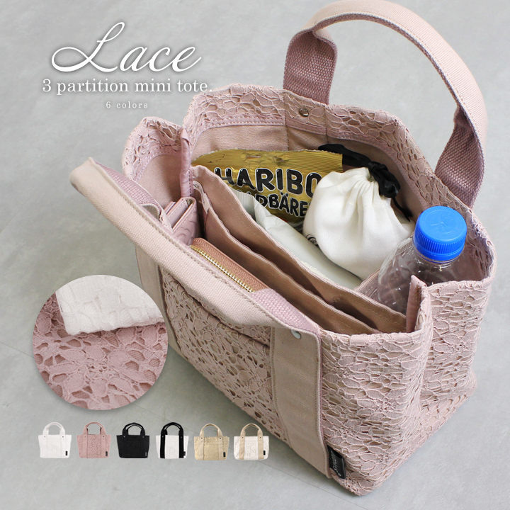 トートバッグ 小さめ レディース ミニトートバッグ 仕切りトートバッグ b5 マチ広 軽量 かるいバッグ レース キャンバス コットン LIZDAYS