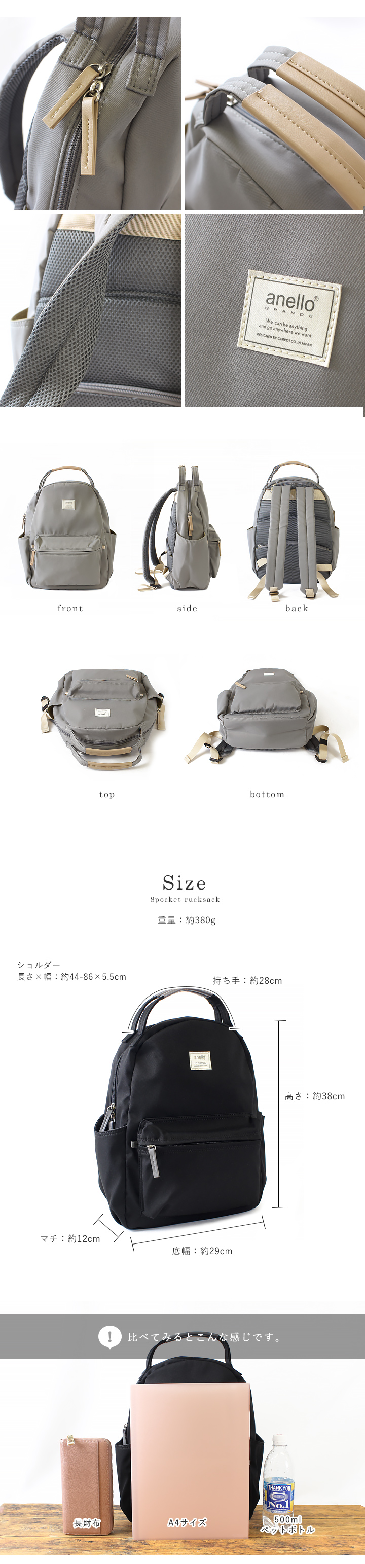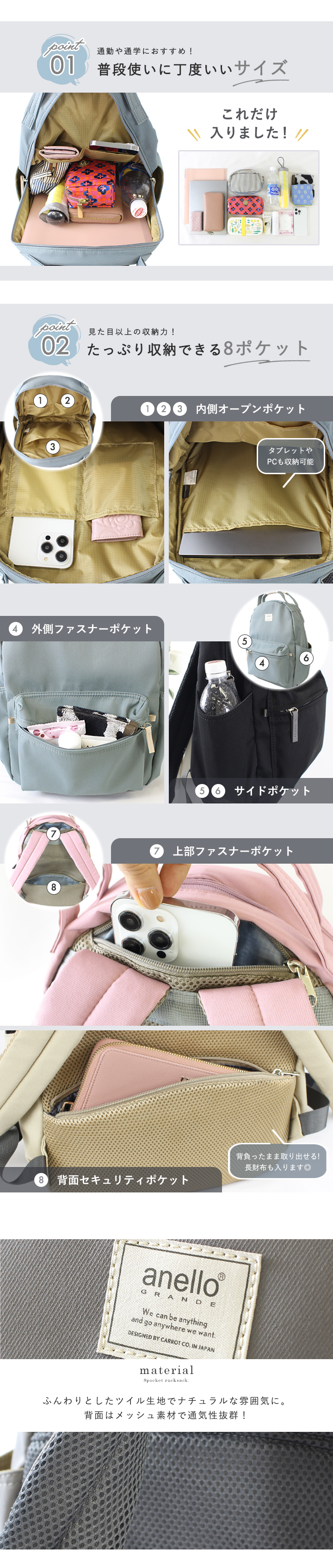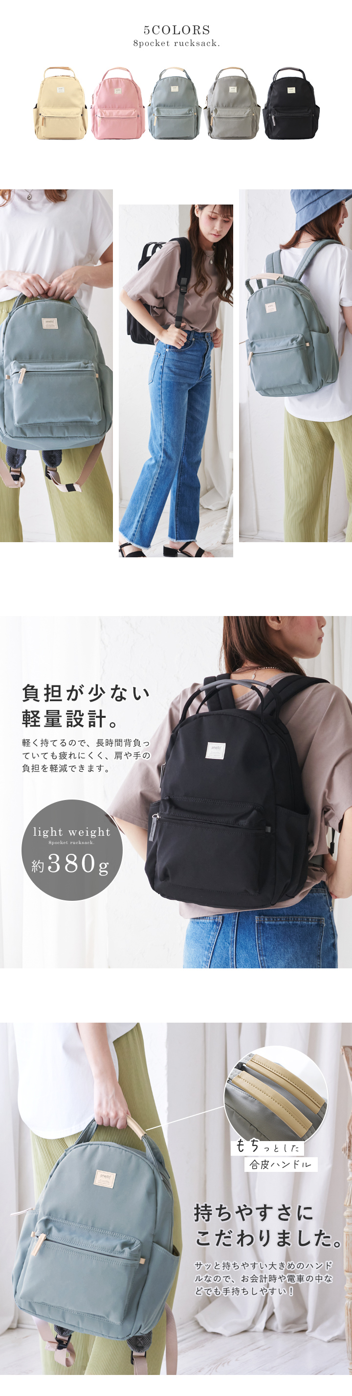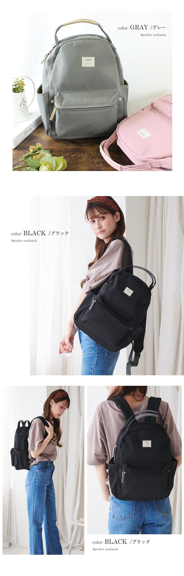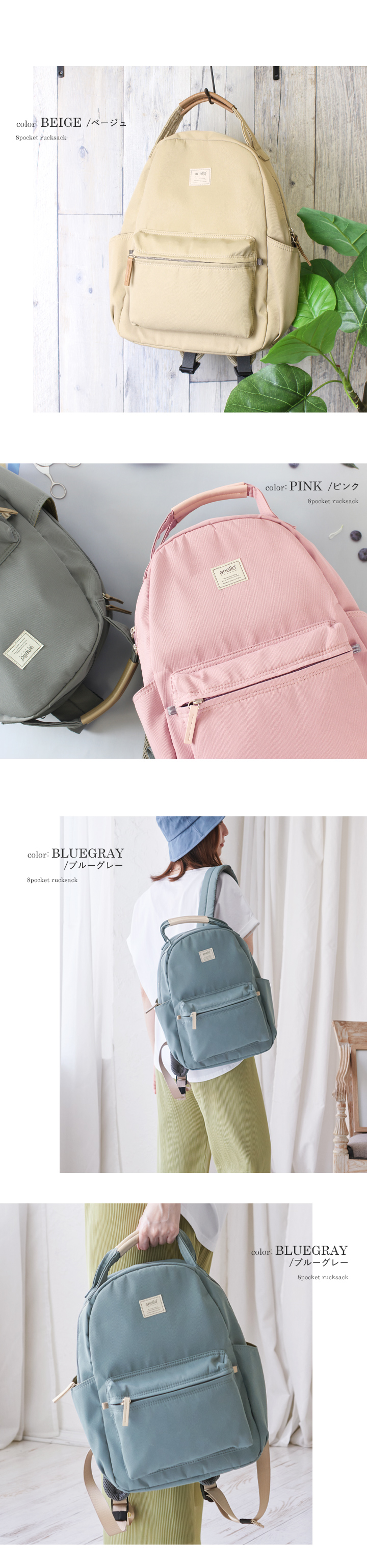 anello アネロ 8ポケット リュック レディース メンズ ユニセックス 大容量 リュックサック ハンドル付き デイパック 旅行 軽量 多収納