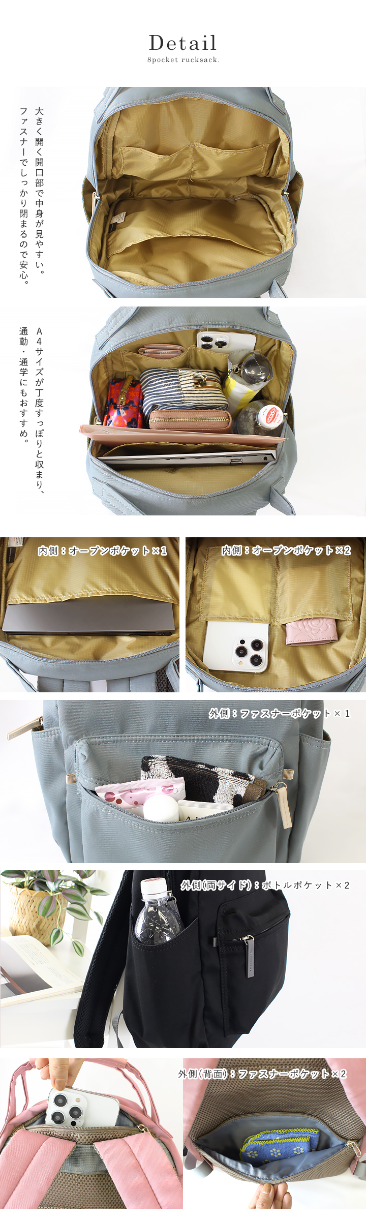 たっぷり収納できる8ポケットデイパック。